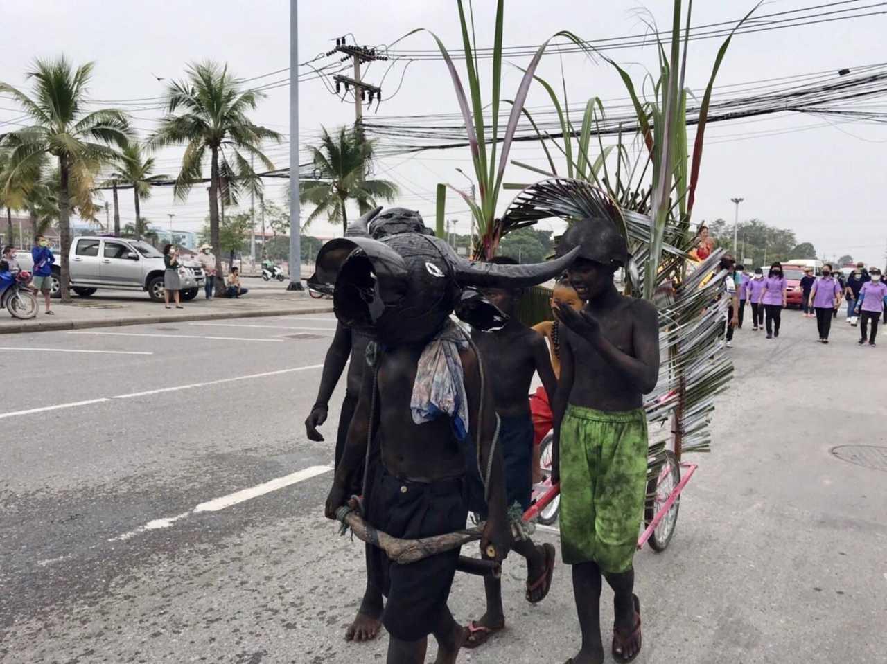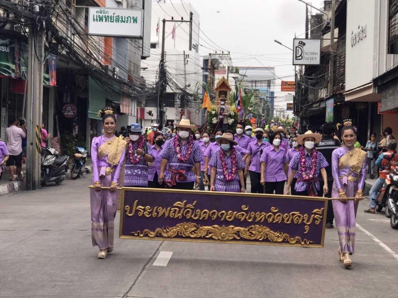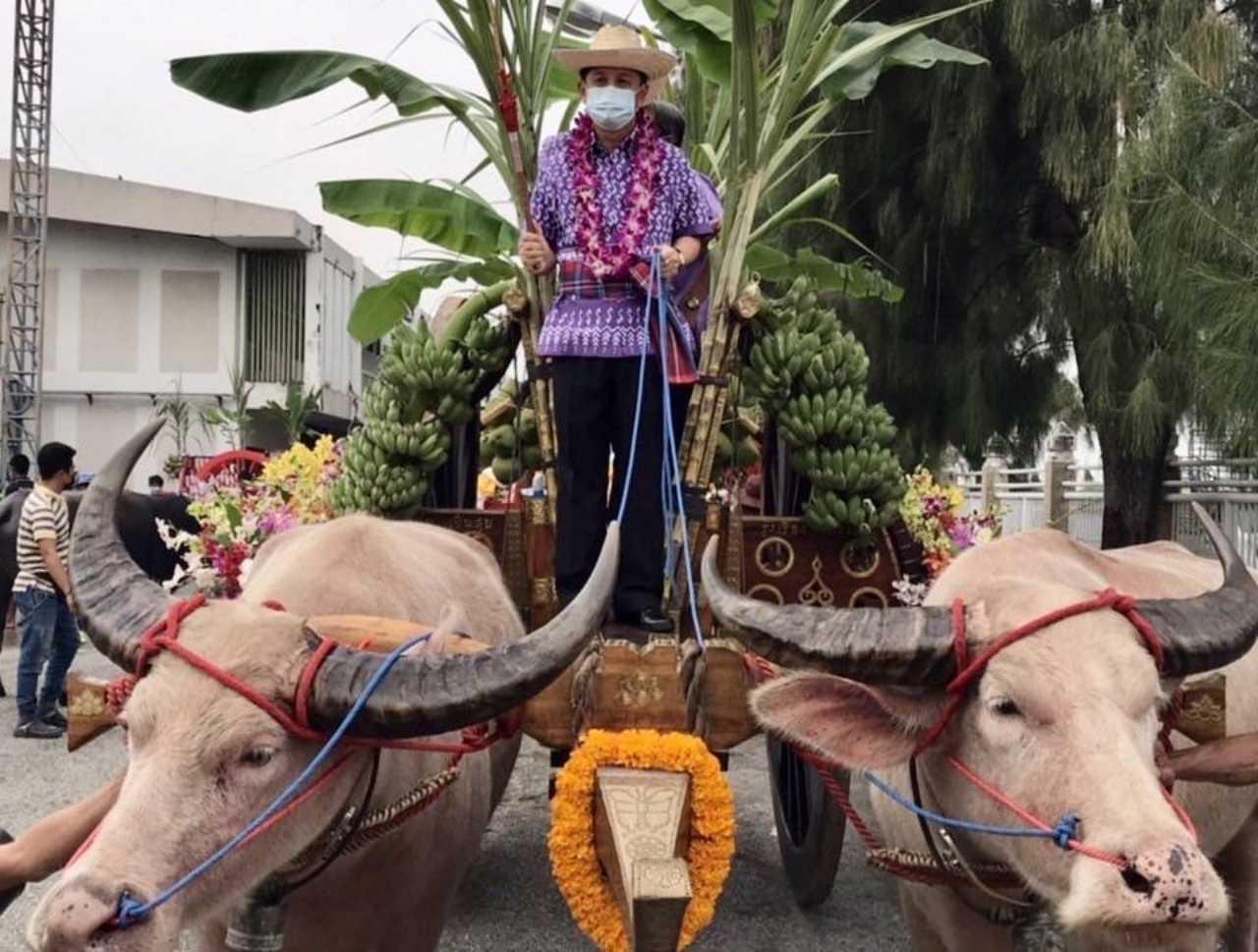 นายภัครธรณ์ เทียนไชย ผวจ.ชลบุรี นางเบญจวรรณ์ สุวานิชย์ นายกเทศมนตรีตำบลเสม็ด พร้อมหัวหน้าส่วนราชการได้ขึ้นยืนบนเกวียนกัณฑ์ ในขบวนริ้วเกวียนกัณฑ์ทั้งหมด 14 เล่ม แห่ควายประเภทสวยงาม ประเภทตลกขบขัน หลังจากนั้นได้เดินแห่รอบตลาดเมืองชลบุรี และขบวนได้แวะเข้าวัดใหญ่อินทาราม (อารามหลวง) นายภัครธรณ์ เทียนไชย ผวจ.ชลบุรี สักการะสมเด็จพระเจ้าตากสินมหาราชตามประเพณี