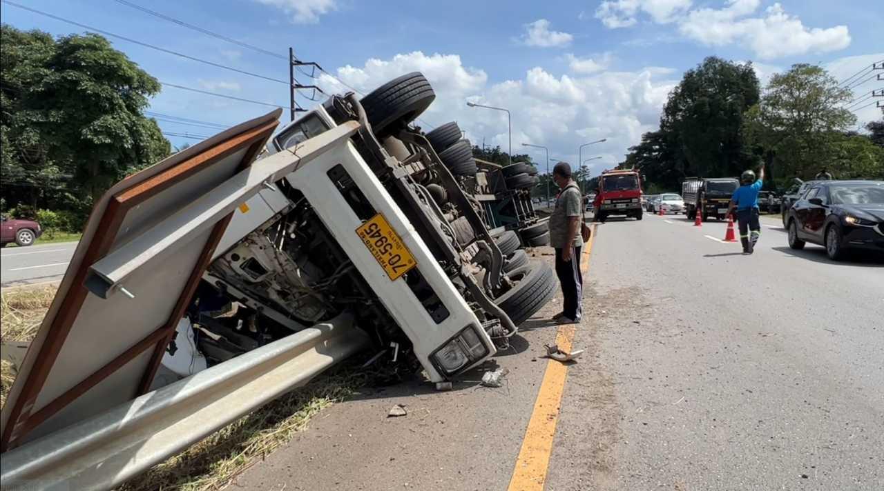 รถบรรทุกคอนเทนเนอร์พลิกบนถนนสุขุมวิท ขาออก โค้งท่าจุ้ย อ.ท่าใหม่ โดยซากรถทับร่างผู้ขับขี่แหลกคาซากรถต้องใช้รถเครนขนาดใหญ่ถึงสองคันในการพลิกรถ เพื่อนำศพออกมา ศีรษะหายไป จนท.ยังหาไม่เจอ