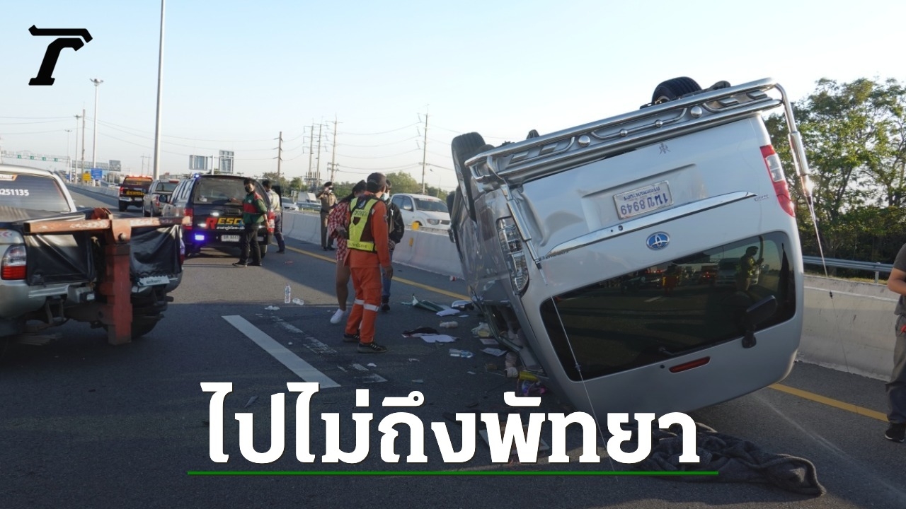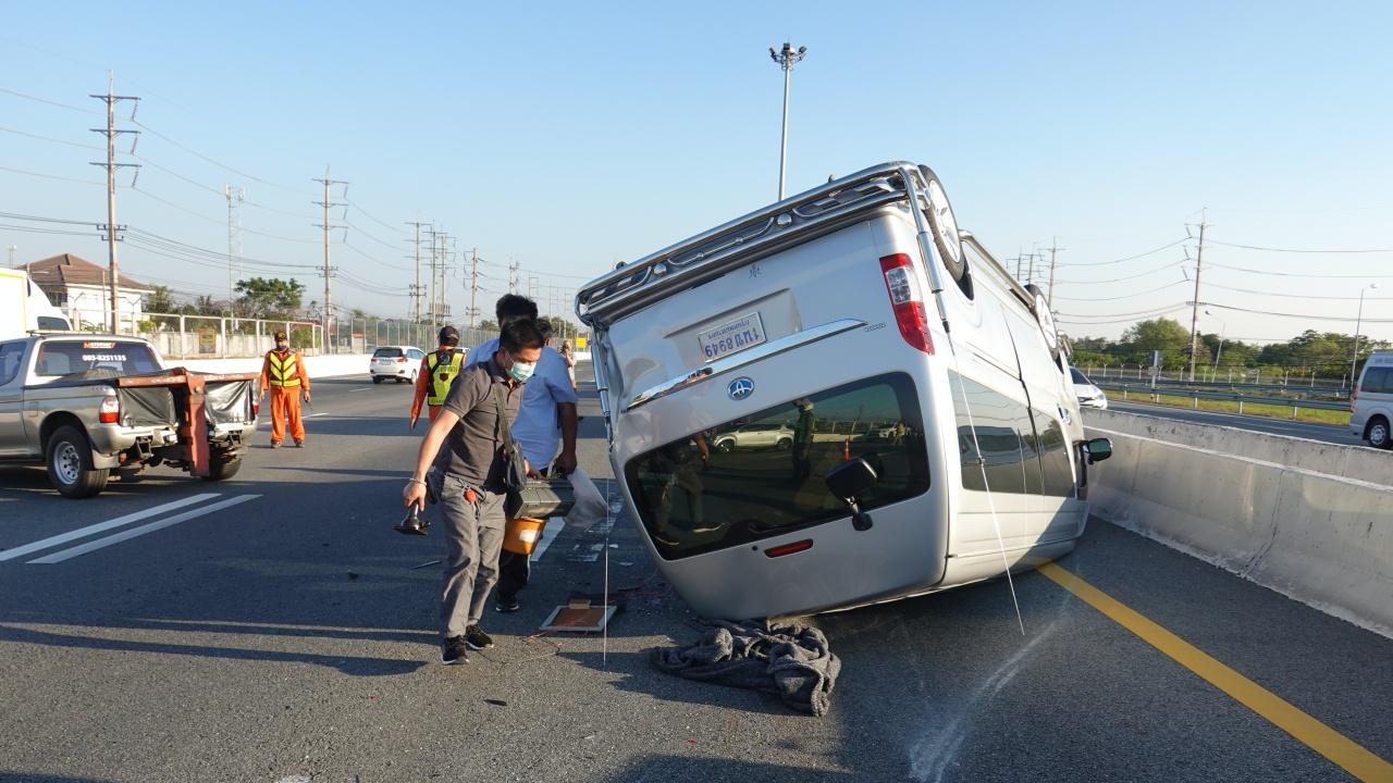 หนุ่มวัย 24 อ้างหลับใน ทำรถกระบะขับส่ายไปมา ก่อนเฉี่ยวกับรถตู้รับนักท่องเที่ยวเต็มคันขับอยู่เลนซ้าย หมุนคว้างกลางถนนไปชนรถกระบะอีกคันพลิกคว่ำหงายท้อง มีผู้ได้รับบาดเจ็บ 6 คนบนมอเตอร์เวย์ขาเข้าชลบุรี