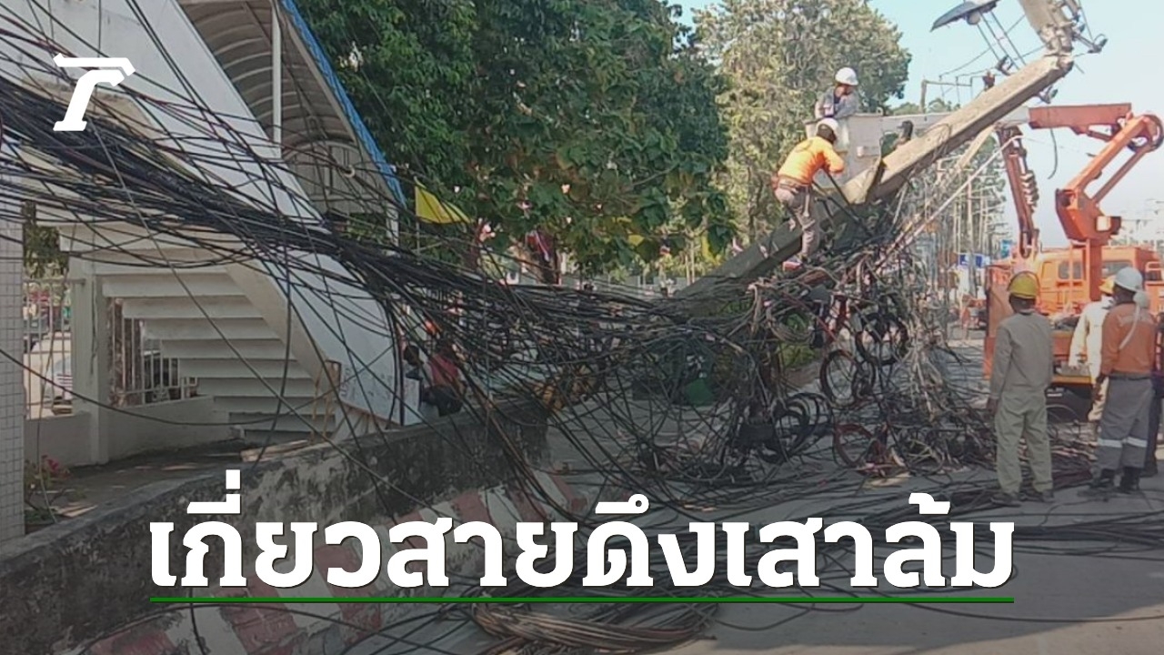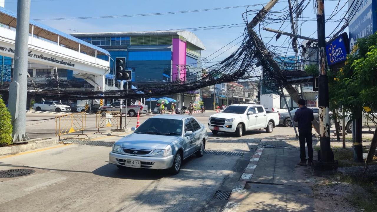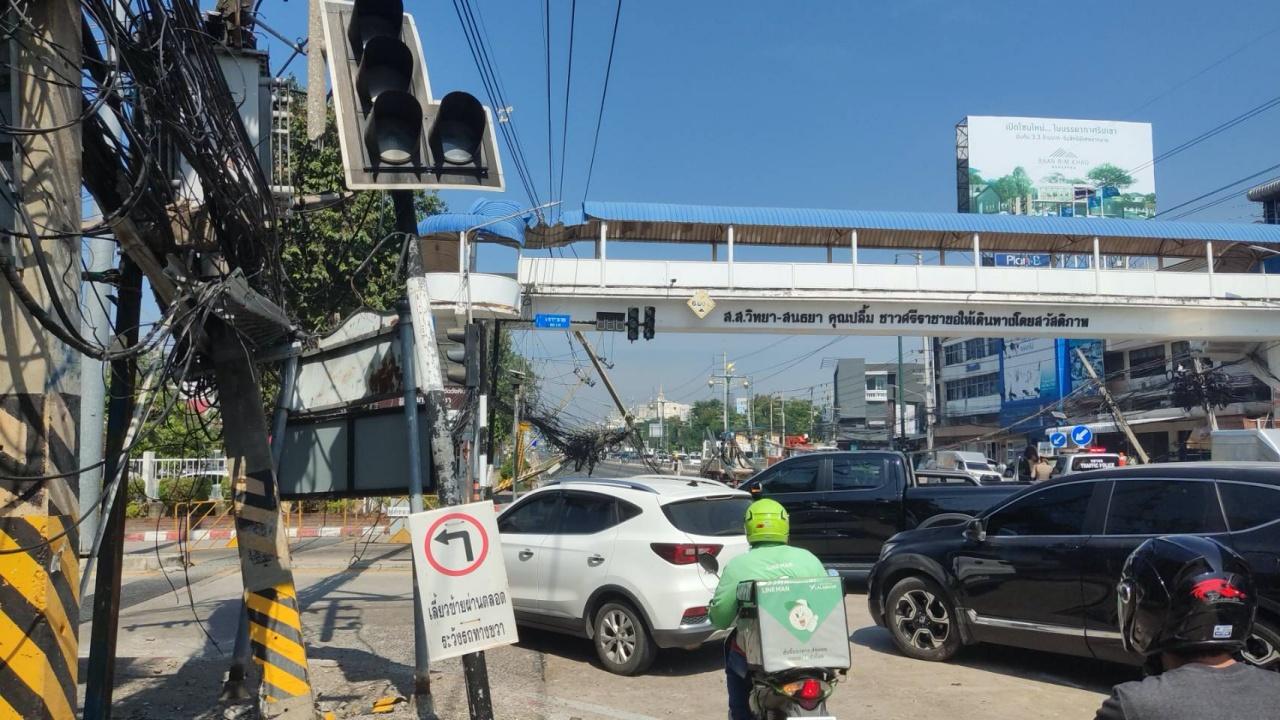 รถบรรทุก 6 ล้อ เกี่ยวสายสื่อสารที่ห้อยย้อยระโยงระยาง กลางแยกวังหิน ถนนสุขุมวิท อ.ศรีราชา ดึงเสาไฟฟ้าล้มระเนระนาด 5 ต้น
