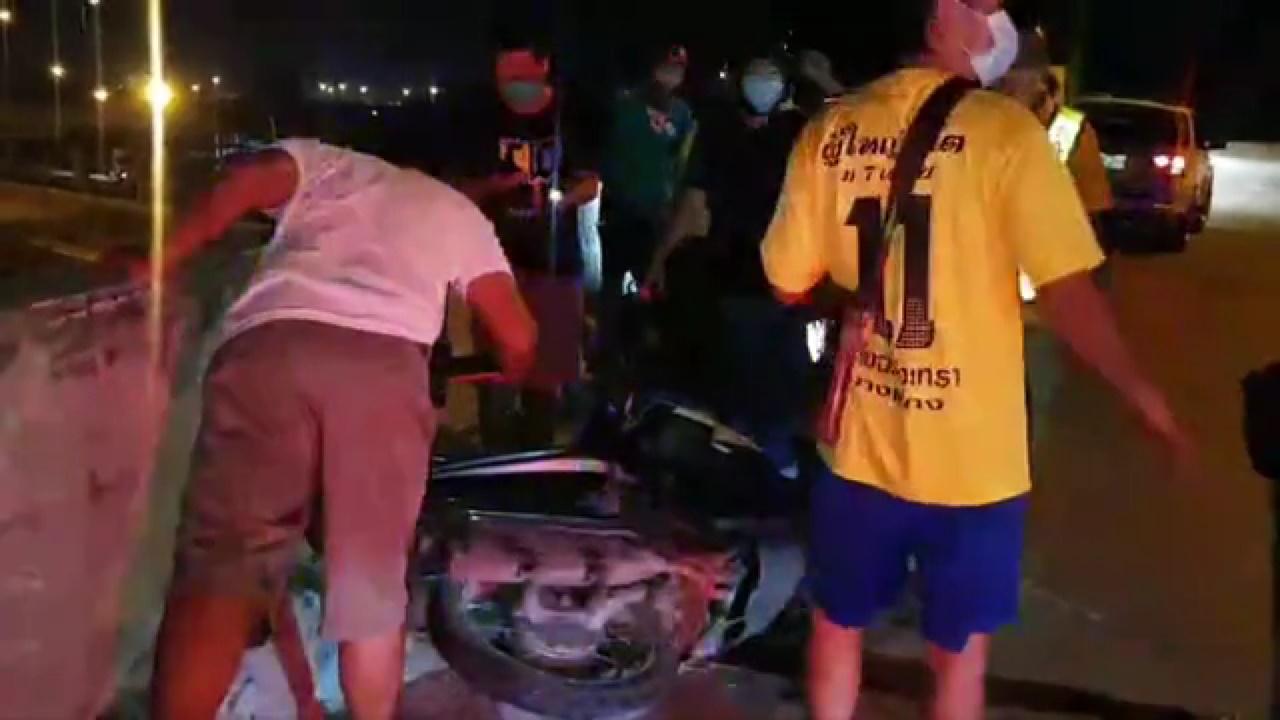 เกิดอุบัติเหตุรถจักรยานยนต์เสียหลักหลุดโค้งสะพานกลับรถรูปเกือกม้า ทำให้คนขี่พลัดตกลงมากระแทกพื้นเบื้องล่างได้รับบาดเจ็บสาหัส