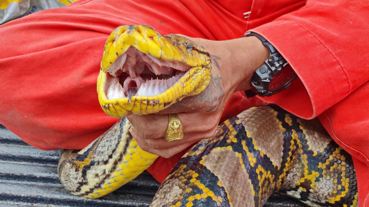 ที่เกิดเหตุพบคนงานกำลังรุมล้อมโอ่ง ซึ่งภายในมีงูเหลือมขนาดใหญ่ ไม่ทราบเพศ ลำตัวขนาดท่อนขาคน ความยาวราว 5 เมตร ต้องใช้เจ้าหน้าที่ถึง 4 คน ยกงูที่น้ำหนักไม่ต่ำกว่า 60 กิโลกรัม เบื้องต้น เนื่องจากไม่มีถุงขนาดใหญ่ที่จะใส่ตัวงูได้พอ เจ้าหน้าที่จึงได้ช่วยกันจับใส่ท้ายรถกระบะ พร้อมมีเจ้าหน้าที่นั่งเฝ้า 1 นาย นำปล่อยคืนสู่ธรรมชาติในพื้นที่ห่างไกลบ้านเรือนประชาชน