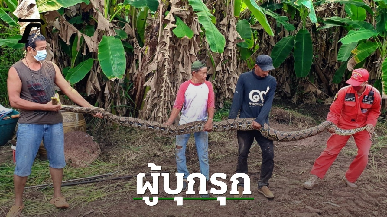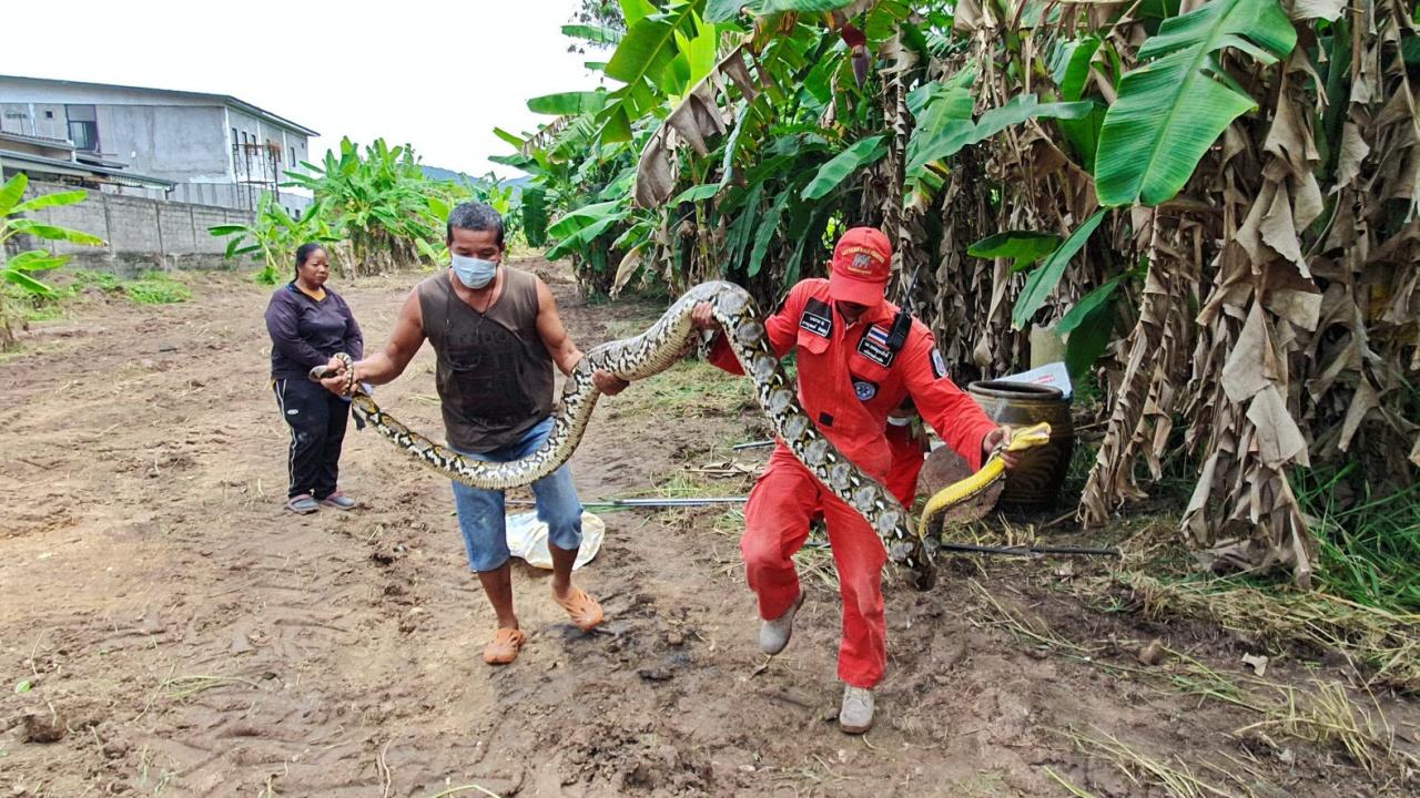 เจ้าหน้าที่ ปภ.เทศบาลที่สัตหีบ ออกปฏิบัติการจับงู หลังรับแจ้งมีการบุกรุกพื้นที่ส่วนบุคคล พบผู้บุกรุกเป็นงูเหลือมยักษ์ยาวประมาณ 5 เมตร หนีซมซานไปซ่อนอยู่ในโอ่งน้ำ ต้องใช้กำลังชายฉกรรจ์ 4 คนยกขึ้นรถ ยังมีสมาชิกในครอบครัวอีก 2 ตัว แต่หนีไปได้