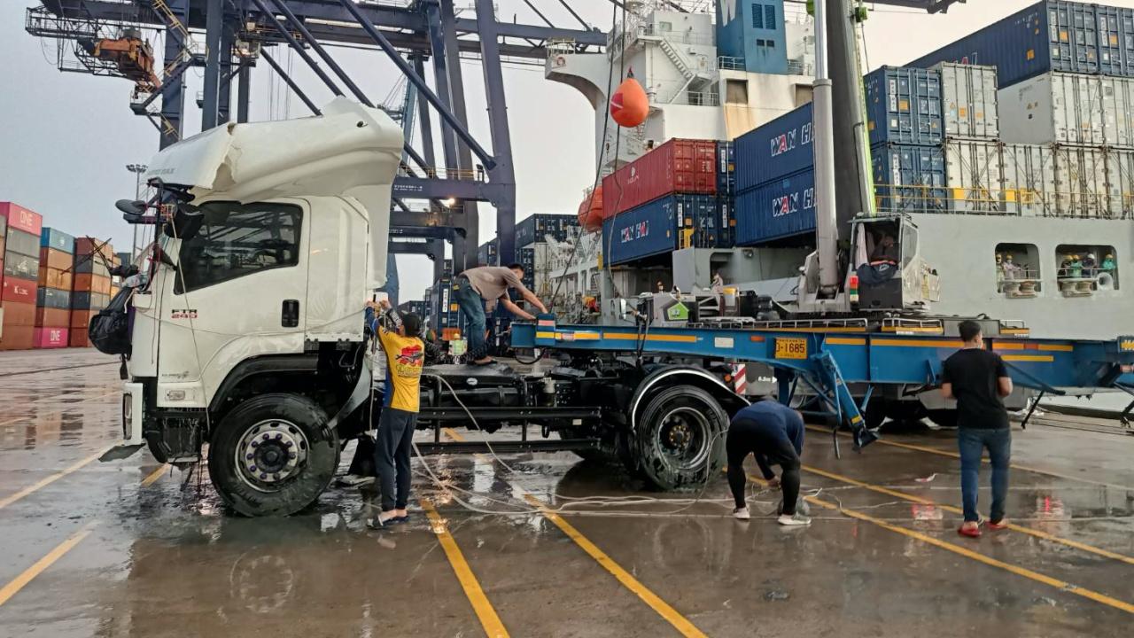 เวลา 02.30 น. วันที่ 19 กุมภาพันธ์ พ.ต.ท.พีระพงษ์ หนูชนะ สว.สอบสวน สภ.แหลมฉบัง ต.ทุ่งสุขลา อ.ศรีราชา จ.ชลบุรี ได้รับแจ้งว่าเกิดเหตุรถบรรทุก 18 ล้อ พุ่งตกลงทะเล มีผู้ขับขี่ติดอยู่ภายใน เหตุเกิดภายในท่าเรือ เอ 3 ในพื้นที่ท่าเรือแหลมฉบัง ต.ทุ่งสุขลา อ.ศรีราชา จ.ชลบุรี จึงรีบรุดไปตรวจสอบ พร้อมด้วยเจ้าหน้าที่หน่วยกู้ภัยสว่างประทีป ศรีราชา นำกำลังทีมประดาน้ำเข้าช่วยเหลือ