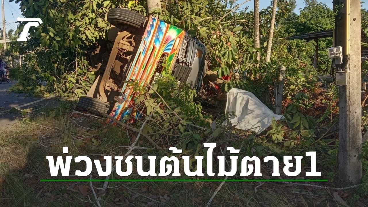 รถบรรทุกพ่วง 18 ล้อบรรทุกปาล์ม หลุดโค้งเกือบพุ่งเข้าบ้าน ต้นไม้ใหญ่หักโค่นทับร่างคนขับที่กระเด็นตกลงมาจากตัวหน้ารถผู้เป็นสามีเสียชีวิตคาที่ เมียอาการสาหัสกู้ภัยพนมนำส่งโรงพยาบาลแปลงยาว