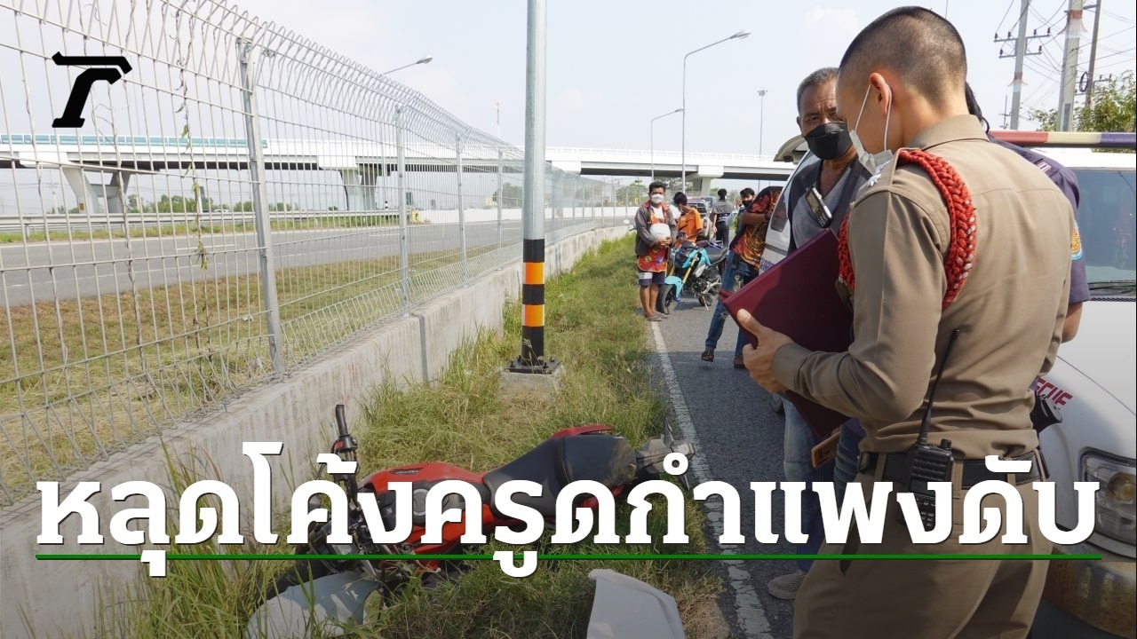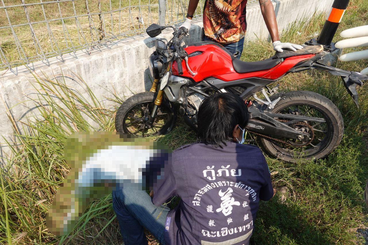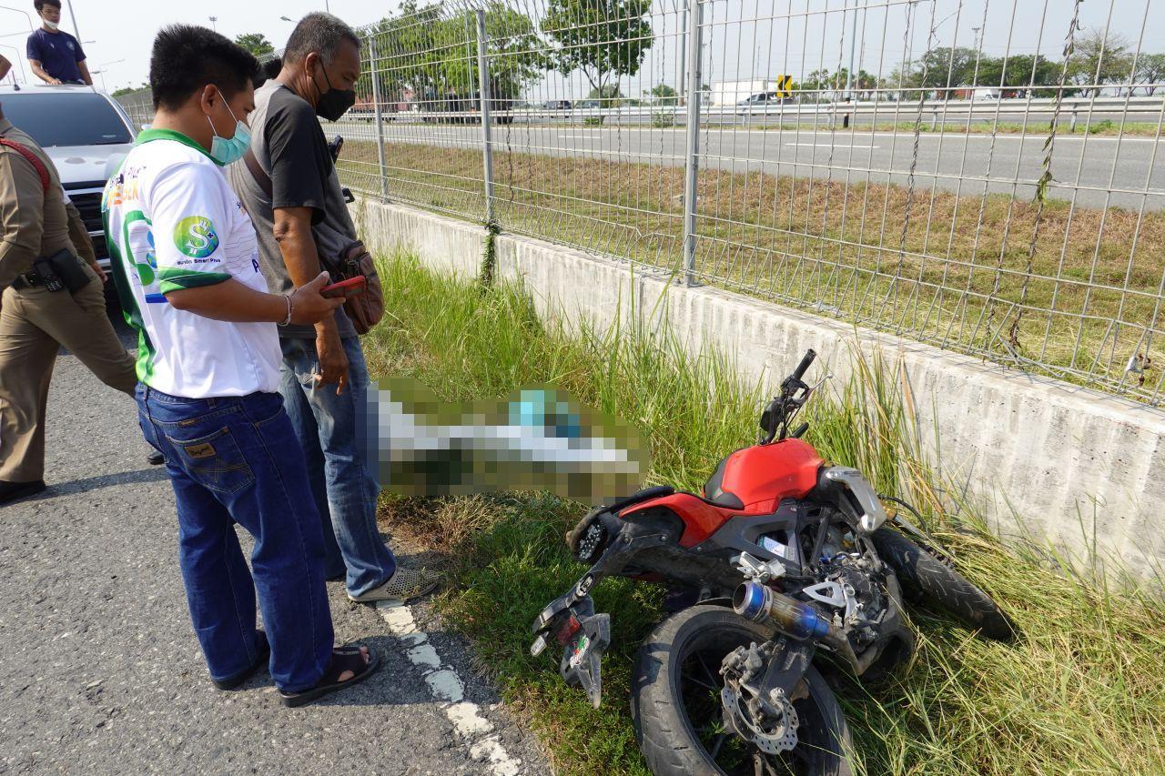 หนุ่ม 35 ขี่ จยย.มาเร็วก่อนจะหลุดทางโค้งเดนโซ่ หลังนิคมอุตสาหกรรมเวลโกร์ว อ.บางปะกง ชนครูดไถลกำแพงรั้วมอเตอร์เวย์ไปเกือบ 10 เมตร ก่อนจะล้มคว่ำอยู่ข้างทางเสียชีวิตคาที่ คาดมาเร็วไม่ระวัง