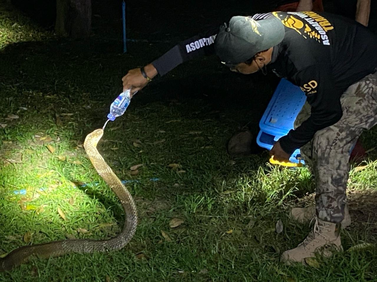 หลังจากปรับพฤติกรรมเจ้าจงอางยักษ์ให้หายตกใจแล้ว ทีมงานได้ทำการวัดความยาวได้ 3 เมตร 40 เซนติเมตร น้ำหนัก 6 กิโลกรัม จากการสอบถาม นายธันวา เจ้าของบ้าน ทราบว่า เมื่อช่วงค่ำได้ยินเสียงหมาเห่าแบบแปลกๆ จึงนำไฟส่องหา พบจงอางยักษ์ตัวนี้กำลังเลื้อยหนีสุนัขเข้ามาในบ้าน จึงแจ้งอาสาพิทักษ์งูเมืองจันท์ เขตโป่งน้ำร้อน เพื่อมาช่วยเหลือ