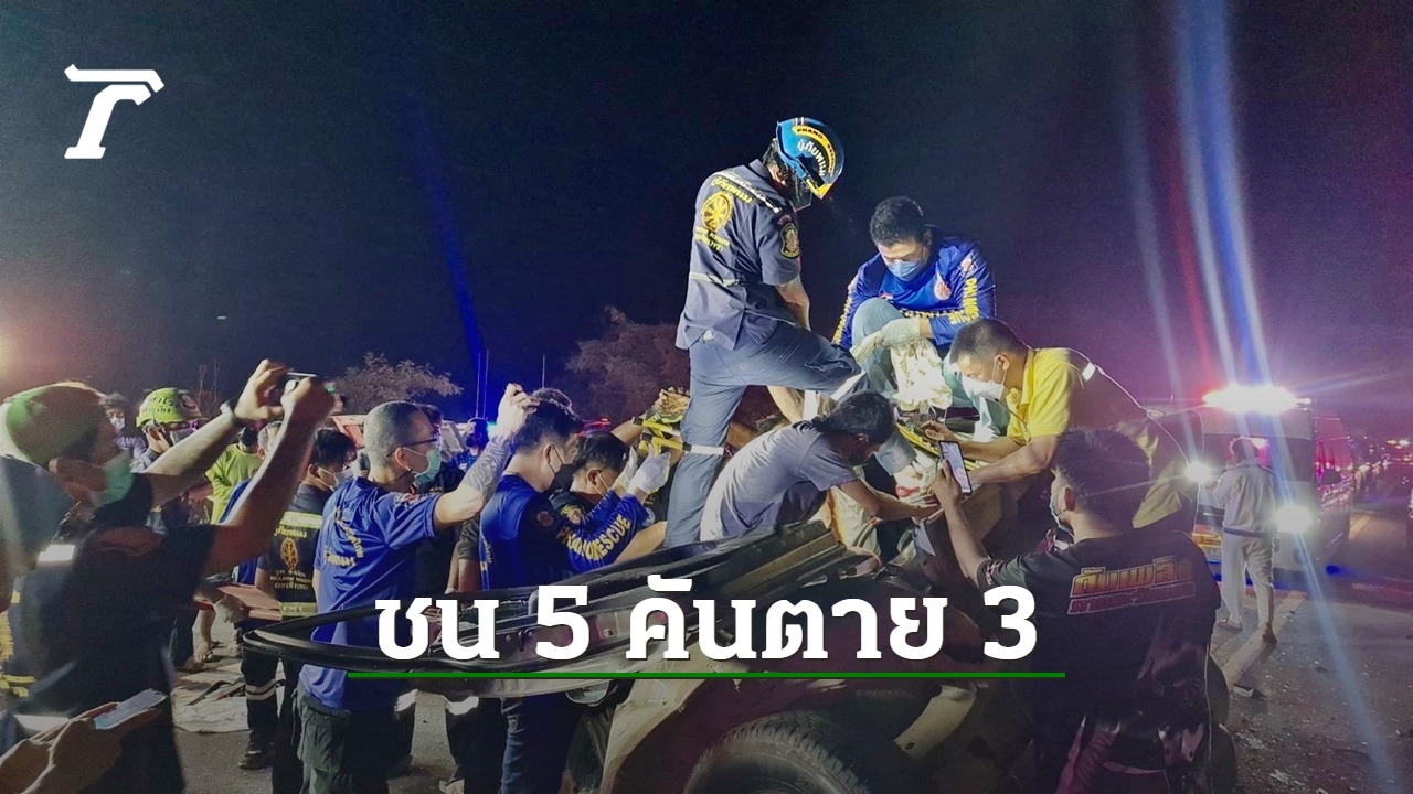 รถกระบะมาเร็วแซงขวาไม่พ้น พุ่งชนรถ 5 คัน ก่อนพลิกตะแคงคนละทิศละทางพังยับ ดับคาที่ 3 ศพ สุดสลดหญิงท้อง 3 เดือนเสียชีวิตในซากรถ