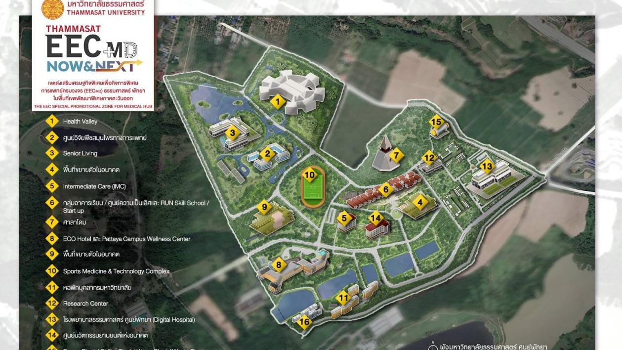 ด้าน รศ.นพ. กัมมาล กุมาร ปาวา รองอธิการบดีฝ่ายบริหาร ศูนย์พัทยา มธ. กล่าวว่า มหาวิทยาลัยธรรมศาสตร์ ศูนย์พัทยา คือพื้นที่แห่งอนาคตที่ไม่ใช่แค่ แคมปัสการศึกษา แต่มีศักยภาพสูงในการพัฒนาเป็น Medical Valley ต้นแบบของประเทศไทย โดยบูรณาการสร้างระบบการแพทย์ครบวงจร ทั้งการผลิตบุคลากร การศึกษาวิจัย การรักษาและการส่งเสริมสุขภาพไว้ในพื้นที่เดียวกัน เราจะได้เห็นสถาบันการศึกษา สถาบันวิจัยการแพทย์ชั้นสูง โรงพยาบาลดิจิทัล ศูนย์ดูแลสุขภาพ (Wellness Health Resort) ศูนย์ดูแลผู้สูงอายุ (Senior Living) และศูนย์กีฬาขนาดใหญ่ (Sport Complex) พร้อมเชื่อมต่อการลงทุนกับกลุ่ม Health Tech ชั้นนำระดับโลกมากมาย ภายใต้แนวคิด Better Future Beyond Boundaries มุ่งแก้ปัญหาความเหลื่อมล้ำทางเศรษฐกิจและสังคมไทยด้วยวิธีการใหม่ๆ ก้าวข้ามพรมแดนการทำงานแบบเดิมของสถาบันการศึกษา ซึ่งขณะนี้มีนักลงทุนทั้งในและต่างประเทศติดต่อเข้ามาเพื่อลงทุนในพื้นที่ EECmd จำนวนมาก นับเป็นการก้าวสู่มิติใหม่ของมหาวิทยาลัยธรรมศาสตร์ในทศวรรษหน้า