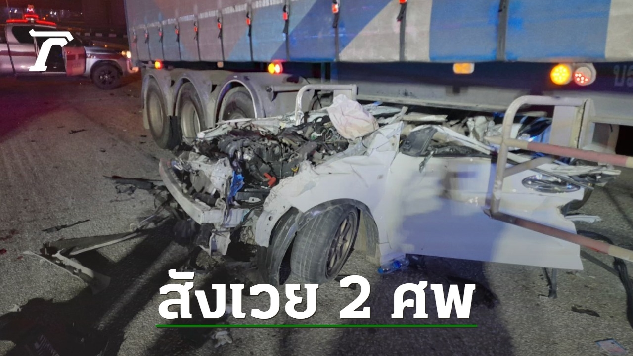 2 สาวซิ่งเก๋ง ชนพ่วง 22 ล้อ รถพังยับ-เป็นศพดับคู่ โชเฟอร์พ่วงเผยเก๋งขับตรงมาด้วยความเร็ว-ส่ายไปส่ายมา พุ่งชนกลางพ่วงมุดติดใต้ท้อง-เป็นเหตุสลด
