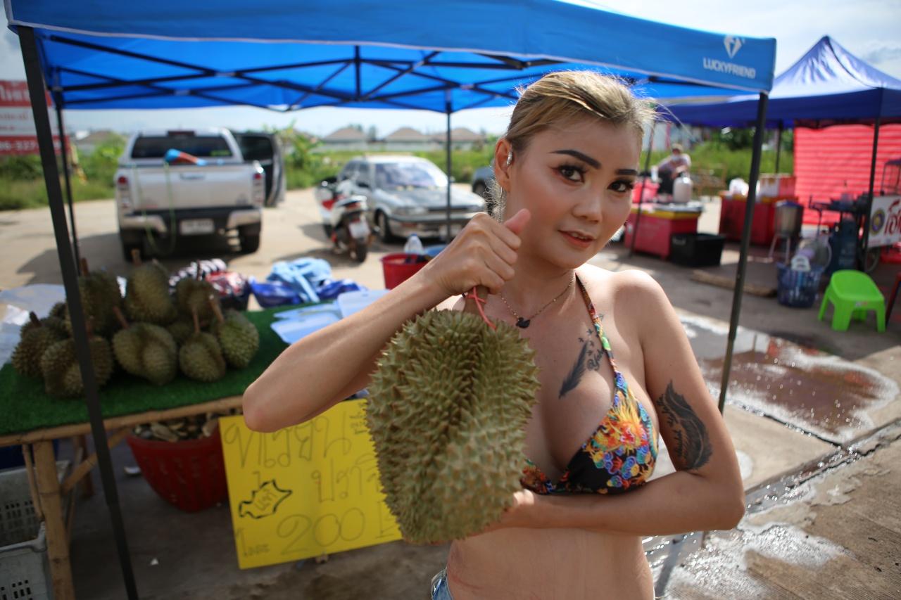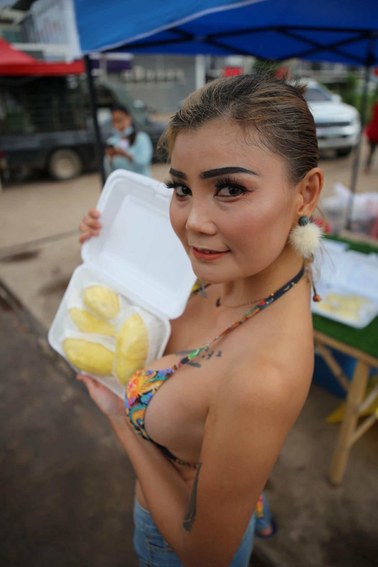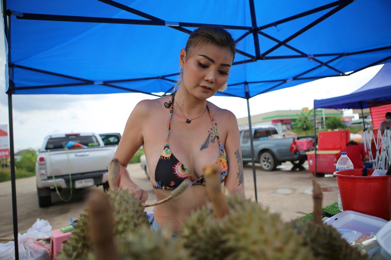 "น้องเหมียว" แม่ค้าหุ่นแซ่บ นุ่งขาสั้นใส่บราตัวเดียว ยืนปอกทุเรียนขายด้วยท่าทางทะมัดทะแมง ริมถนน 3079 ที่ อ.ศรีมหาโพธิ จ.ปราจีนบุรี เผยแต่งตัวแบบนี้อยู่แล้ว แถมลูกค้าก็เข้ามาซื้อแบบไม่ขาดสาย