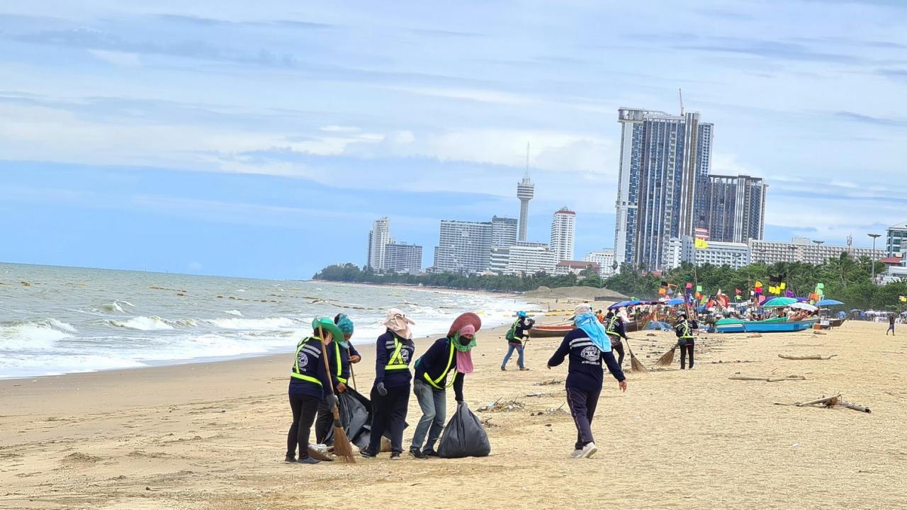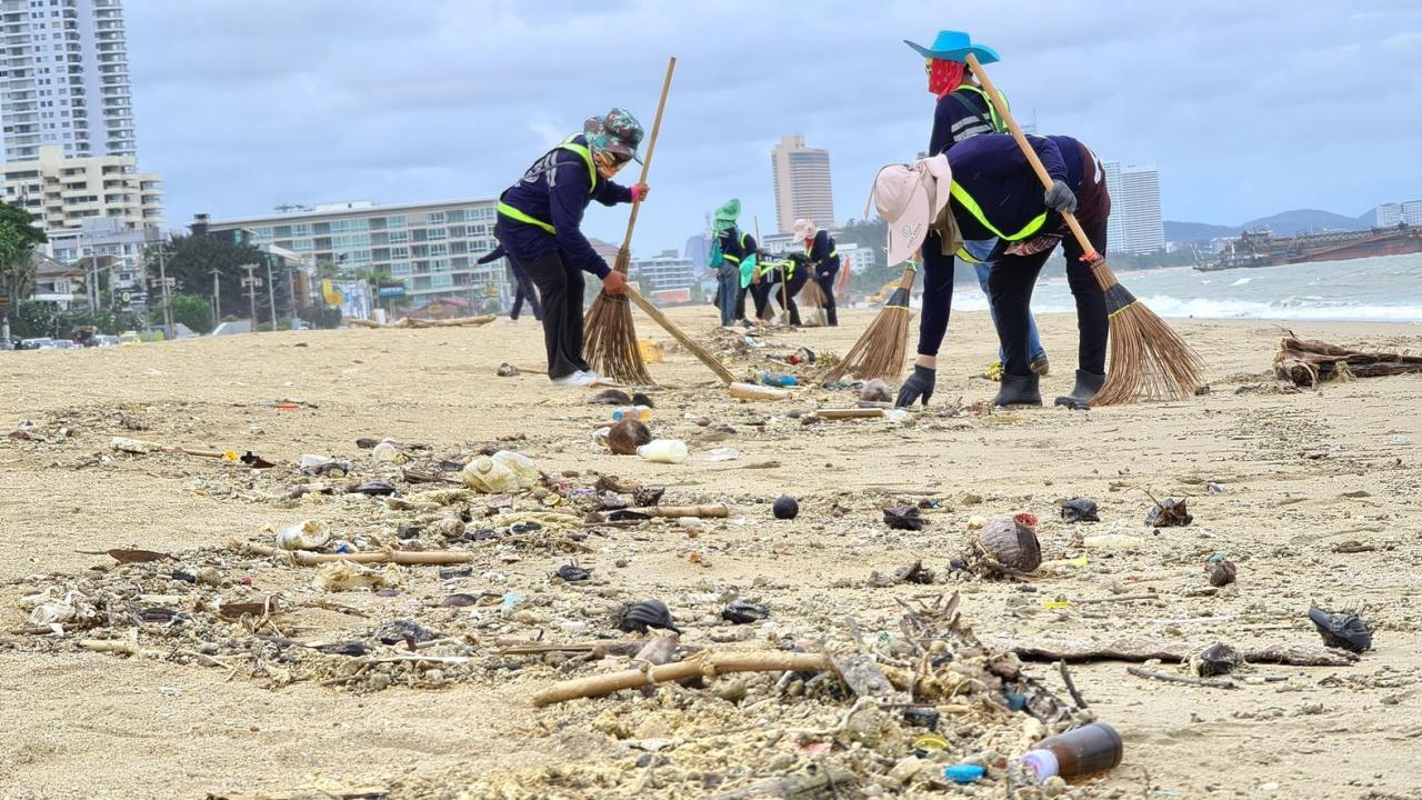 ทต.นาจอมเทียน ส่งกำลังเจ้าหน้าที่เก็บขยะ ฟื้นฟูแนวชายหาดนาจอมเทียนให้เกิดความสะอาดสวยงาม หลังคลื่นลมซัดขยะขึ้นมาเกลื่อน เผย หญิงวัย 45-55 เหล่านี้ ต้องกวาดหาดทรายและถนนแลกค่าแรงวันละ 336 บาท
