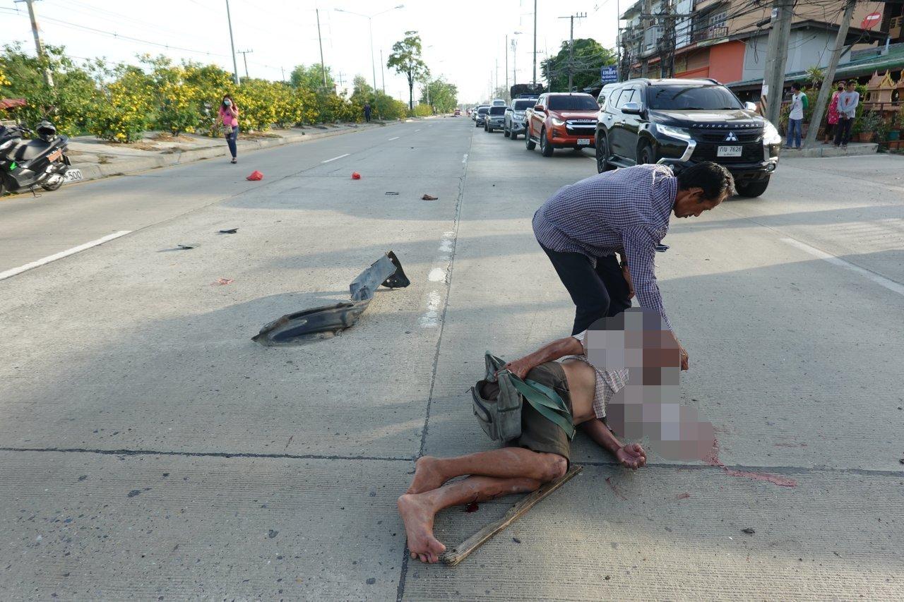 ห่างไปเกือบ 300 เมตรพบ รถจักรยานยนต์ ยามาฮ่า เบล สีแดง ทะเบียน ฉ-8589 ฉะเชิงเทรา ลักษณะพ่วงข้าง ถูกเฉี่ยวชนจนพังเสียหายจอดอยู่เลนขวา พบนายสุดใจ วิมลรัตน์ อายุ 66 ปี ผู้ขับขี่ นอนได้รับบาดเจ็บอยู่บนถนน พบว่าขาซ้ายหัก ศีรษะแตก ถลอกตามร่างกาย เจ้าหน้าที่เร่งทำการปฐมพยาบาลก่อนนำส่งโรงพยาบาลบางปะกง ห่างไปอีก 100 เมตรพบ รถยนต์โตโยต้า ฟอร์จูนเนอร์ สีบรอนซ์ ทะเบียน กง 6665 ฉะเชิงเทรา ด้านหน้าขวาพังเสียหาย ยางหน้าซ้ายแตก โดยมีซากรถจักรยานยนต์ของผู้เสียชีวิตติดอยู่ใต้ท้องรถ มีนางภัคชัญญา ศรีชวนะ อายุ 52 ปี เป็นคนขับ