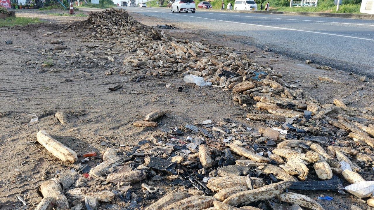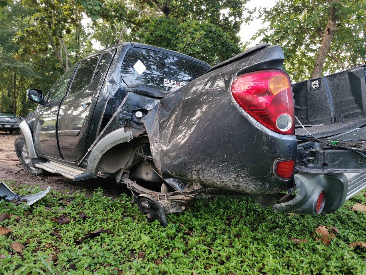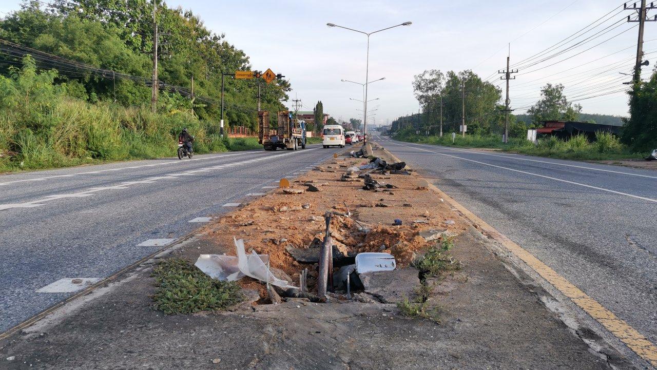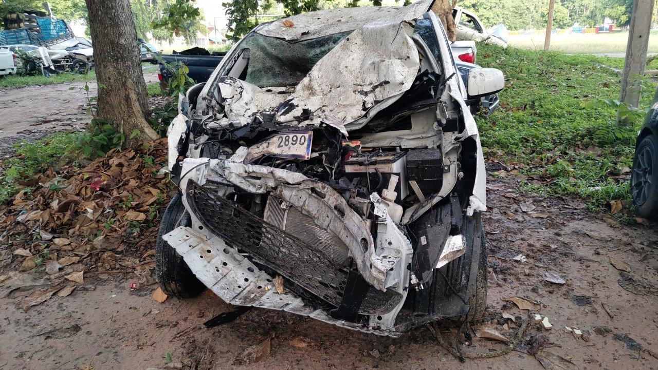ในที่เกิดเหตุพบรถยนต์กระบะมิตซูบิชิ ไทรทัน สีดำ 4 ประตู ทะเบียน กธ 4853 อุบลราชธานี ด้านหน้าพังยับ ล้อหลังซ้ายหลุดออกจากตัวรถ ขับขี่โดย นายอโนชา ปีตะเสน อายุ 47 ปี ชาวบ้านหมู่ 4 ตำบลมาบยางพร อำเภอปลวกแดง จังหวัดระยอง ได้รับบาดเจ็บเล็กน้อย ห่างออกไปเล็กน้อยพบรถยนต์เก๋งยี่ห้อมิตซูบิชิ แอทราจ สีขาว ทะเบียน งร 2890 ชลบุรี ด้านหน้าพังยับ ถุงลมนิรภัยทำงาน ขับขี่โดย นายธีรดิต บุญสีทุม อายุ 35 ปี ชาวบ้านหมู่ 5 ตำบลนิคมพัฒนา อำเภอนิคมพัฒนา จังหวัดระยอง ได้รับบาดเจ็บเล็กน้อยเพราะถุงลมนิรภัยทำงาน และห่างออกไปประมาณ 10 เมตร พบรถยนต์กระบะยี่ห้อมาสด้า บี 2500 ตอนเดียว สีบรอนซ์ ทะเบียน บย 9306 ชลบุรี มีคอกบรรทุกเหง้าสับปะรด ในสภาพพังยับเยิน คนขับชื่อ นายสุรพงษ์ ศรีชัยภูมิ อายุ 50 ปี ชาวบ้านหมู่ 5 ตำบลหลุมรัง อำเภอบ่อพลอย จังหวัดกาญจนบุรี ติดภายในรถ กู้ภัยปลวกแดงต้องใช้เครื่องตัดถ่างนำร่างนายสุรพงษ์ออกมาแล้วนำส่ง รพ.ปลวกแดง แต่เสียชีวิตในเวลาต่อมา