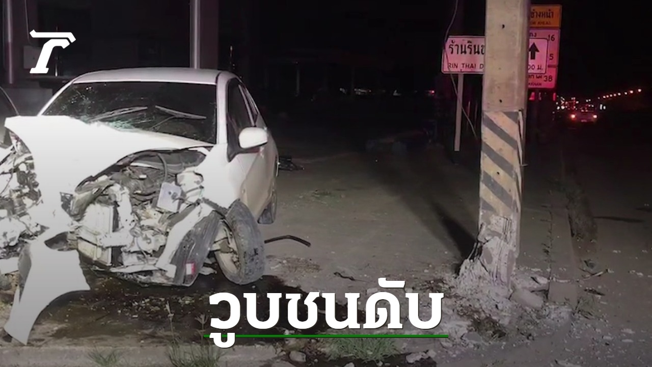 หนุ่มใหญ่ขับเก๋งกลับบ้านกลางดึก เกิดวูบหลับใน เสียหลักชนเสาไฟข้างทาง ดับสนิทคาซากรถ