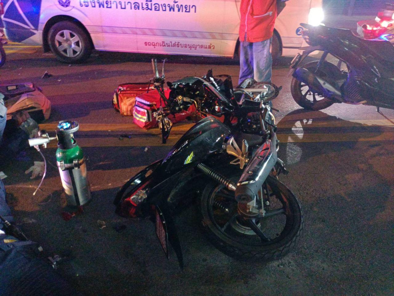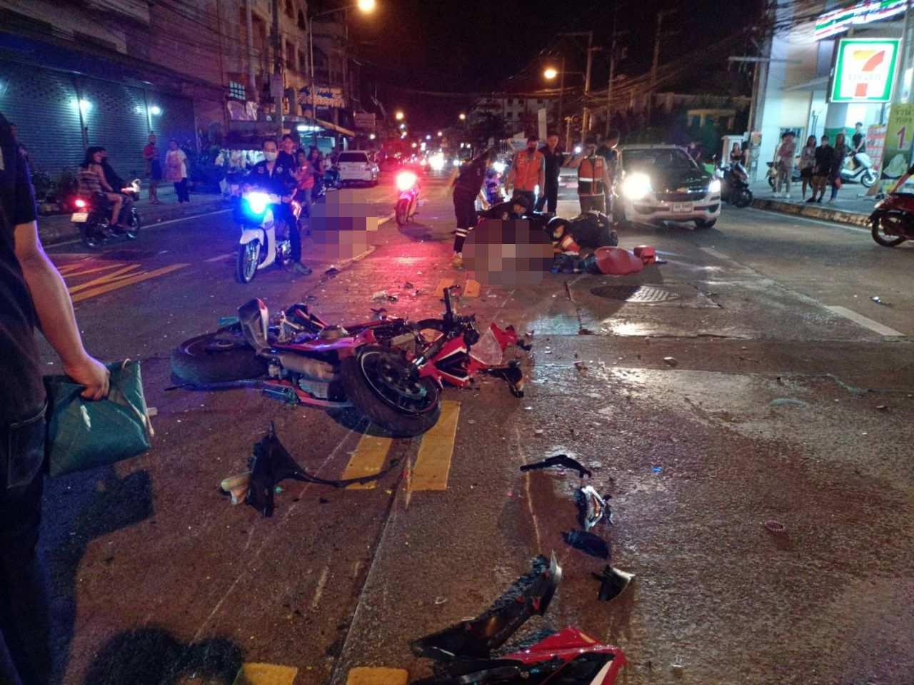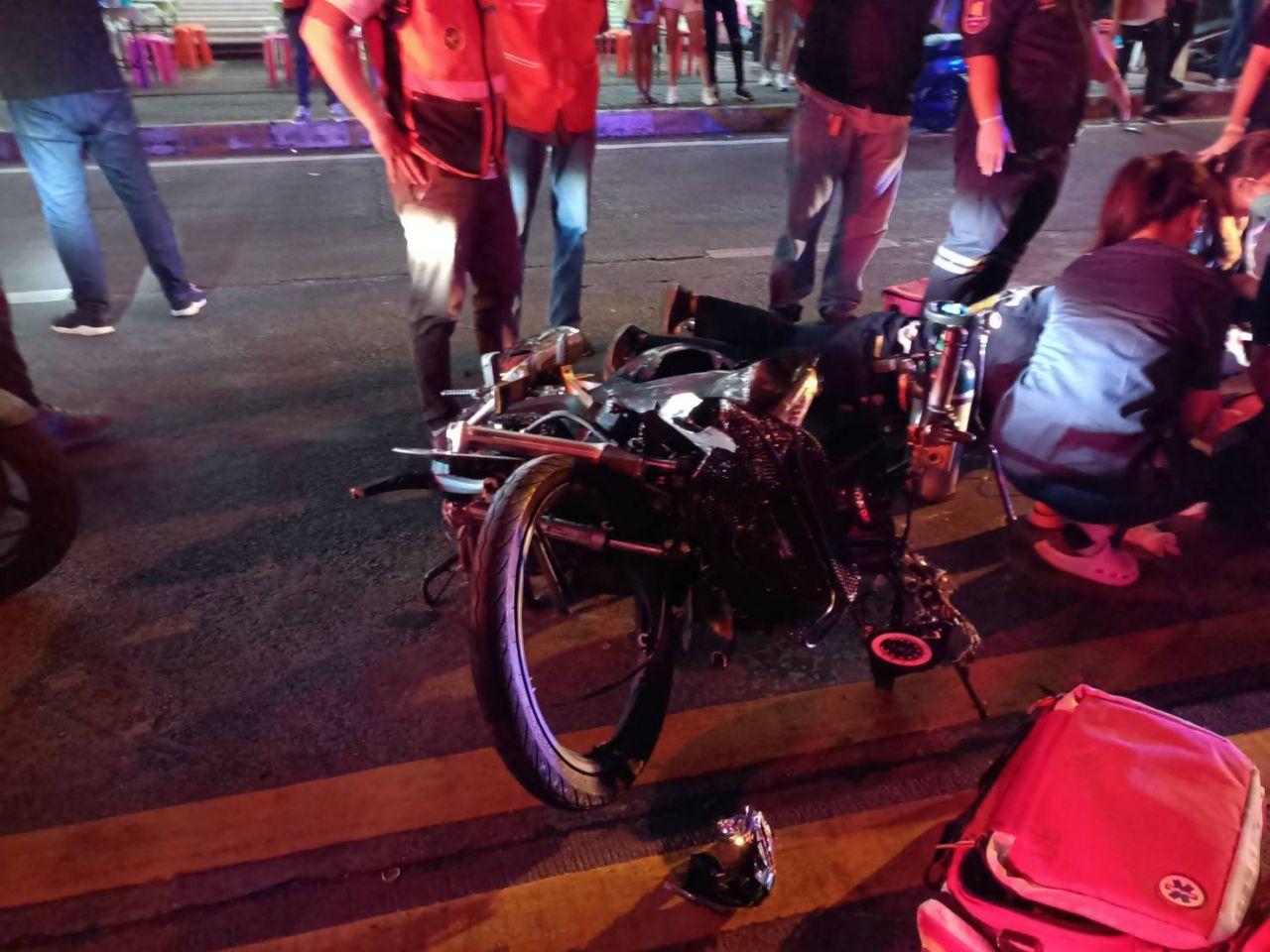 หนุ่มซิ่ง จยย.บิ๊กไบค์ซีบีอาร์ 500 ชนประสานงา จยย.เวฟ ด้วยกันคาแยกซอยเล้งกี่ ถนนพัทยาสาย 3 เจ็บสาหัส ส่วนคู่กรณีตายคาที่ ตร.เมืองพัทยา รอสอบปากคำผู้บาดเจ็บและดูภาพวงจรปิดเพื่อดำเนินการต่อไป