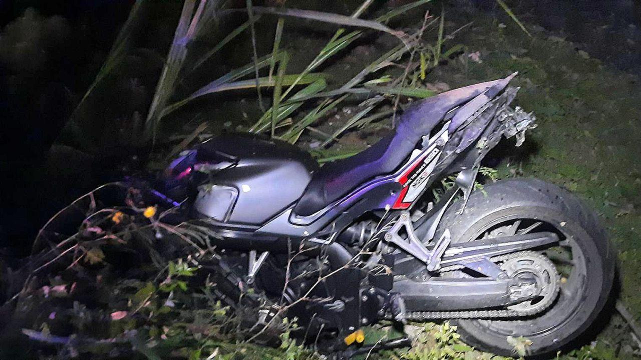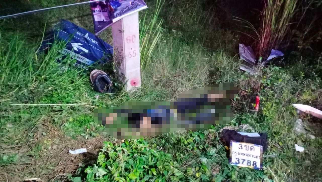 ที่เกิดเหตุพบรถจักรยานยนต์ ฮอนด้า CBR 650 สีดำ ทะเบียน 3 ขค 3788 กรุงเทพมหานคร สภาพพังยับเยิน ชนอัดเสาไฟฟ้ากระเด็น ใกล้กันพบศพ นายสุรศักดิ์ เกกาฤทธิ์ อายุ 26 ปี ชาว อ.บ้านแพง จ.นครพนม ผู้ขับขี่อยู่ในสภาพคอหักตายคาที่