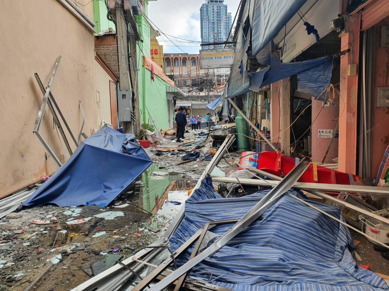 ที่เกิดเหตุเป็นอาคารพาณิชย์สูง 2 ชั้น สร้างเรียงรายติดกันกว่า 10 คูหา แรงระเบิดทำให้ตัวอาคารร้านข้าวมันไก่เสียหายพังพินาศ ทั้งชั้นล่าง และชั้น 2 ข้าวของได้รับความเสียหายกระเด็นกระจัดกระจายไปทั่วบริเวณ โดยพบคนเจ็บนอนสลบอยู่ภายใต้ซากปรักหักพัง 1 ราย ทราบชื่อต่อมาคือ นายคิธ (MR.KHITH) อายุ 29 ปี ชาวลาว ถูกแรงระเบิดอัดร่างลอยกระเด็นมานอนสลบอยู่นอกตัวอาคาร ได้รับบาดเจ็บสาหัส หน่วยกู้ภัยต้องรีบนำตัวส่ง รพ.พัทยา เมโมเรียล ทันที นอกจากนี้แรงระเบิดดังกล่าว ส่งผลให้ตัวอาคารด้านข้างได้รับความเสียหายไปด้วยเช่นกัน