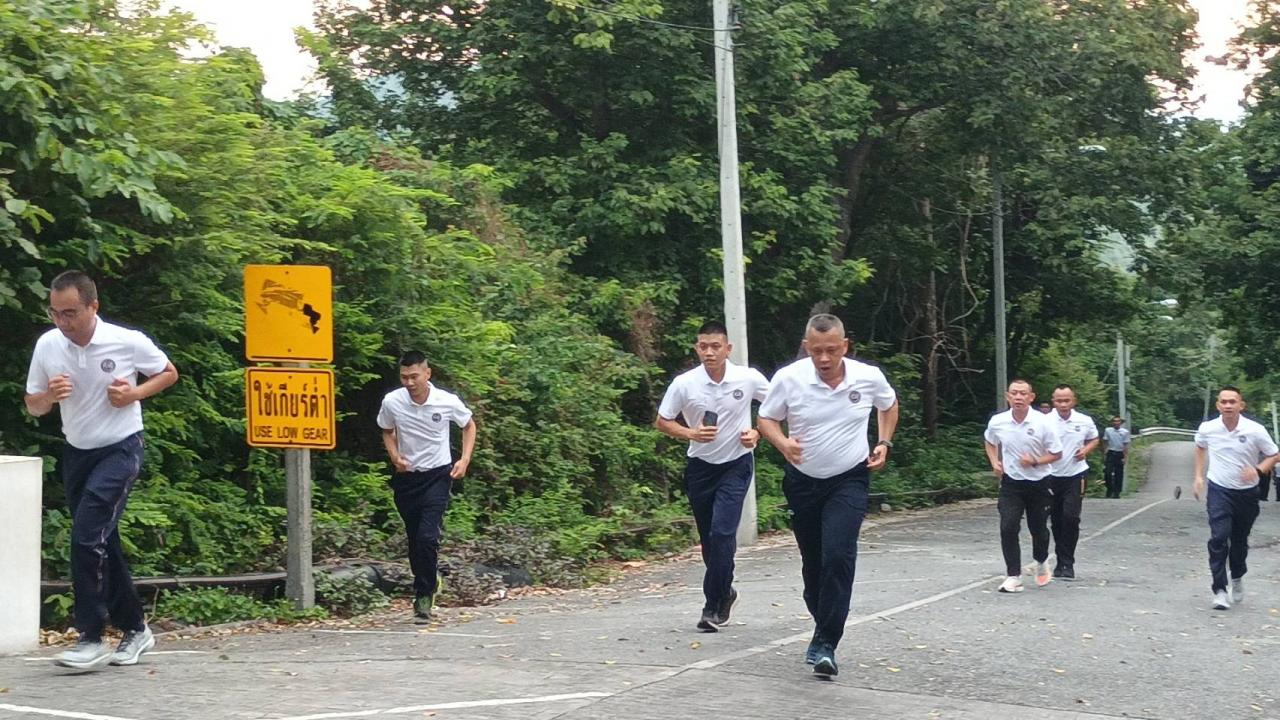สำหรับการนำกำลังพล วิ่งขึ้นไปยังยอดเขาแหลมปู่เจ้า ซึ่งเป็นที่ตั้งของศาลเสด็จเตี่ย และเชื่อกันว่าศาลแห่งนี้มีความศักดิ์สิทธิ์อย่างมาก ดวงพระวิญญาณของเสด็จเตี่ยจะสถิต ณ ศาลแห่งนี้ เพื่อขอพรในการเดินทางไปปฏิบัติราชการในครั้งนี้ โดยได้จัดเครื่องสักการะ เครื่องบวงสรวงสังเวย ประกอบด้วย โภชนาหาร มังสาหาร ผลาหาร และธัญญาหาร ที่พระองค์ชื่นชอบ โดยเฉพาะอาหารทะเลซีฟู้ด เมื่อกำลังพลวิ่งขึ้นไปถึงยอดเขา และถึงศาลเสด็จเตี่ย ก็จะให้กำลังพลร่วมกันทำพิธีบวงสรวง ด้วยการจุดธูป เทียน สักการะ และขอพรให้แคล้วคลาดปลอดภัยจากภัยอันตรายทั้งปวง หลังจากนั้นได้ยิงปืนถวาย จำนวน 19 นัดร่วม