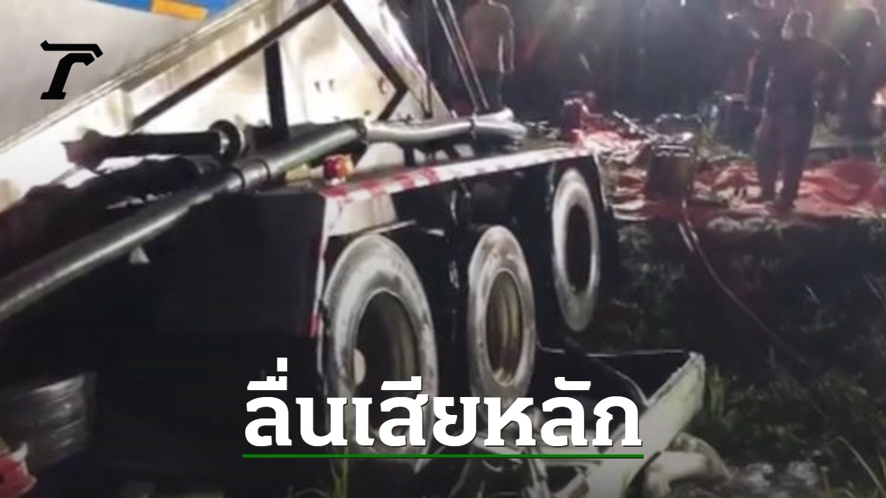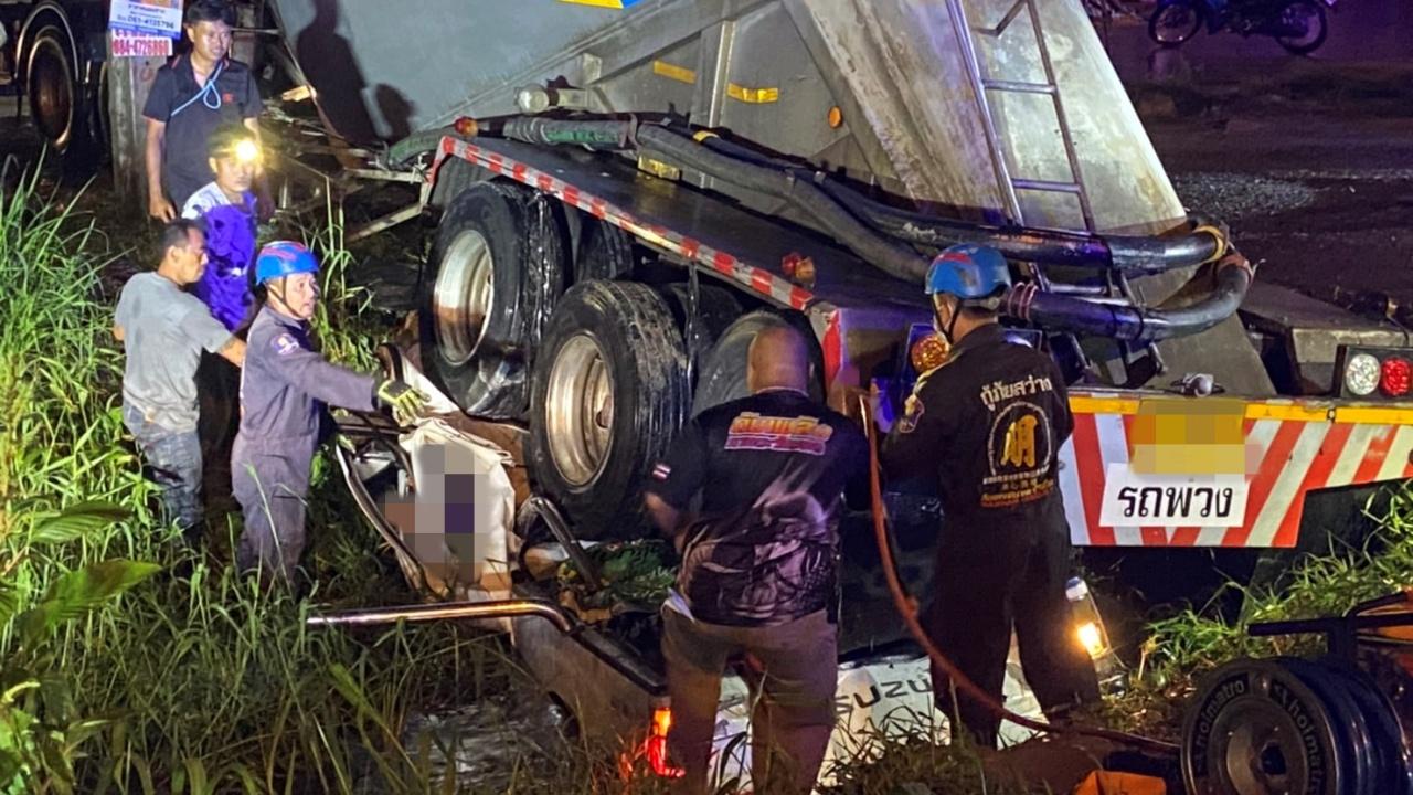 รถเทรลเลอร์บรรทุกปูนลื่นเสียหลัก ชนกระบะ-ลากทับบี้ "3 ชีวิตติดซาก" เจ็บ 2 ตาย 1 คนขับรถปูนเผยฝนตกถนนลื่น กระบะเบรกกระทันหัน หักหลบแล้ว-แต่เสียหลักลื่น
