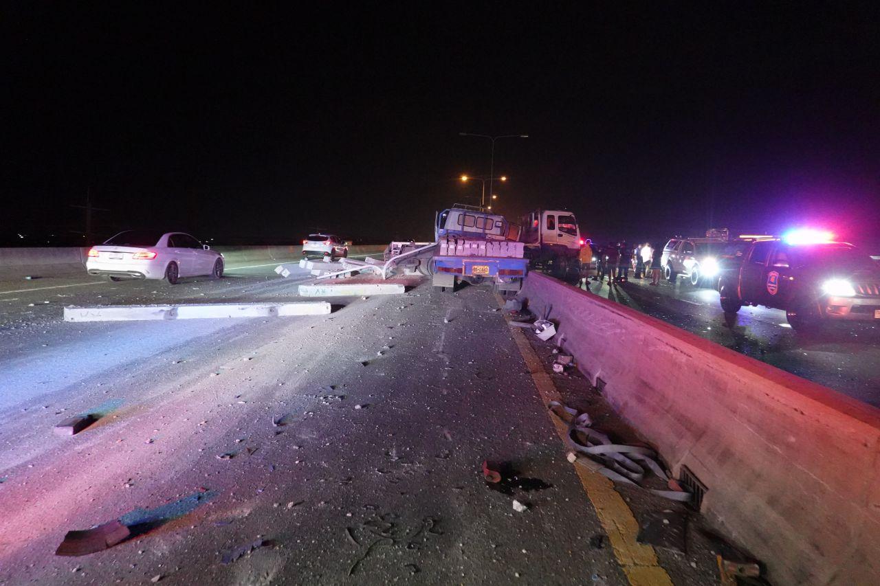 เมื่อเวลา 22.00 น. วันที่ 27 พ.ย. 65 ร.ต.อ.พิรยุทธ แข็งแรง รองสว.(สอบสวน) สภ.บางพลีน้อย จ.สมุทรปราการ พร้อมมูลนิธิป่อเต็กตึ๊ง กู้ชีพบางเสาธง ตรวจสอบเหตุรถชนกันบนทางด่วนบูรพาวิถี กม.34+100 ขาเข้า กทม. หมู่ 5 ต.บางพลีน้อย อ.บางบ่อ พบรถบรรทุกสิบล้อฮีโน่ สีขาว ทะเบียน 71-2111 พระนครศรีอยุธยา เสียหลักชนแบริเออร์และเสาไฟส่องสว่างทางบริเวณเกาะกลาง ก่อนจะข้ามเลนไปยังฝั่งขาเข้าชลบุรี และทำให้ชิ้นส่วนแบบบ้านที่บรรทุกมาจำนวน 11 ชิ้น น้ำหนักชิ้นละ 1 ตัน ตกจากรถกระจายเกลื่อนทางด่วน