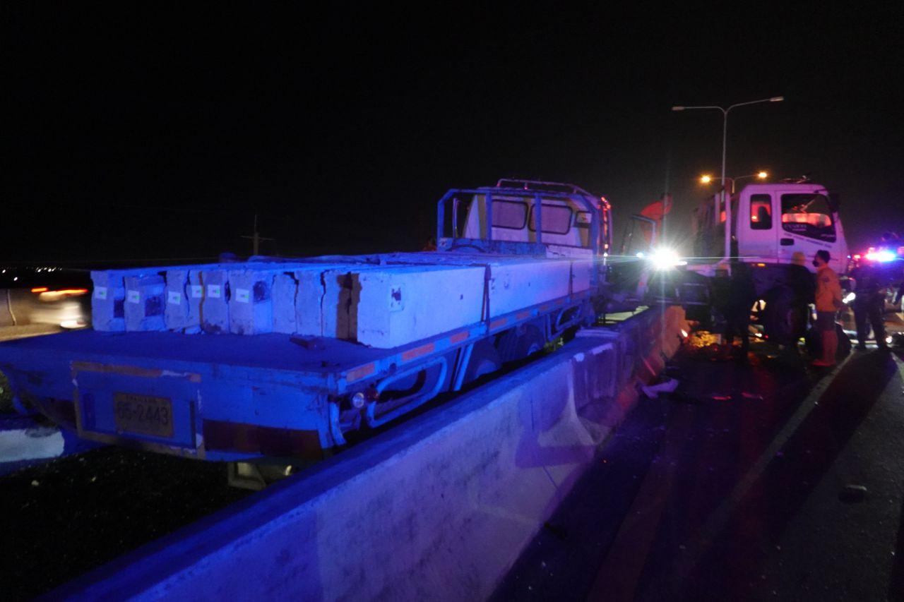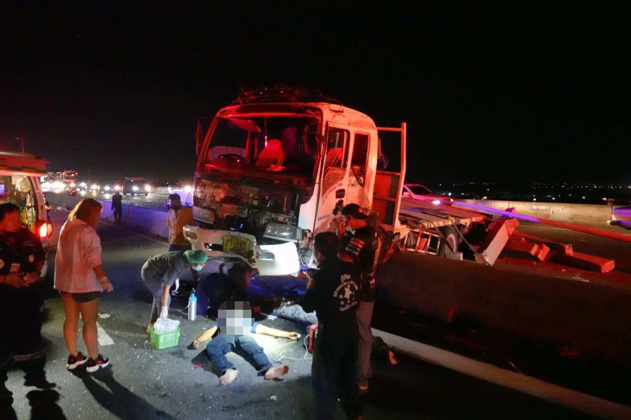 บริเวณบนถนนหน้ารถพบ นายพิชิต มีพิษ อายุ 39 ปี คนขับ และ น.ส.สุดารัตน์ แย้มมาก อายุ 35 ปี เพื่อนสาวที่นั่งมาด้วยกระเด็นออกมานอกรถได้รับบาดเจ็บ ซึ่งทางกู้ภัยเร่งทำการปฐมพยาบาลก่อนนำตัว นายพิชิต ส่งโรงพยาบาลจุฬารัตน์ 11 ส่วน น.ส.สุดารัตน์ ได้รับบาดเจ็บถูกนำตัวส่งโรงพยาบาลรวมชัยประชารักษ์ ในที่เกิดเหตุยังพบรถบรรทุกสิบล้อคู่กรณี ฮีโน่ สีขาว ทะเบียน 65-2443 กรุงเทพมหานคร บรรทุกชิ้นส่วนแบบบ้านเหมือนกัน ชนติดข้างรถขวางอยู่เลนขวาด้านหน้าพังเสียหาย มี นายบุญมา สีสด อายุ 44 ปี เป็นคนขับ ส่วนลูกชายวัย 18 ปี ได้รับบาดเจ็บถูกนำส่งโรงพยาบาลรวมชัยประชารักษ์ เจ้าหน้าที่ต้องปิดช่องทางการจราจรเลนขวาและเลนกลางทั้งสองฝั่ง เพราะเสาไฟทางและชิ้นส่วนแบบบ้านตกขวางถนนจำนวนมาก
