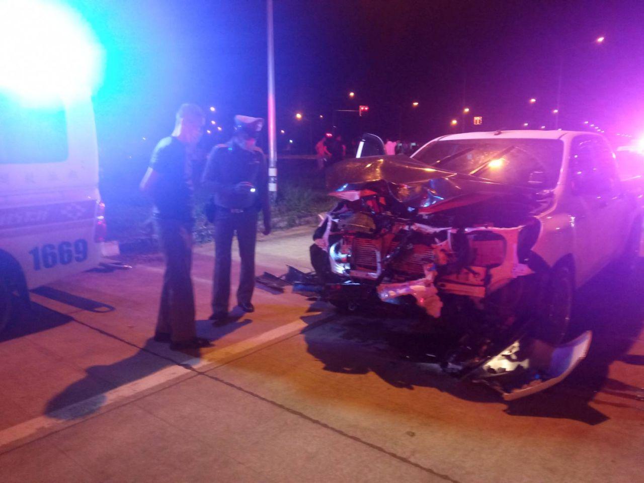 ที่เกิดเหตุพบรถยนต์กระบะสี่ประตูสีขาว ยี่ห้อโตโยต้า ทะเบียน กน 5339 เพชรบูรณ์ จอดอยู่กลางถนน สภาพด้านหน้าพังยับเยิน ห่างออกไปประมาณ 10 เมตร พบรถจักรยานยนต์ฮอนด้า ทะเบียน 1 กบ 6918 ระยอง ถูกชนจนพังทั้งคัน พบศพผู้ชายเสียชีวิต 1 ราย นอนจมกองเลือดอยู่กลางถนน ห่างออกไปริมถนนพบร่างผู้ชายได้รับบาดเจ็บหมดสติหายใจรวยริน เจ้าหน้าที่กู้ภัยช่วยกันทำซีพีอาร์ แต่ก็ไม่สามารถยื้อชีวิตไว้ได้ เสียชีวิตขณะนำส่ง รพ.แกลง