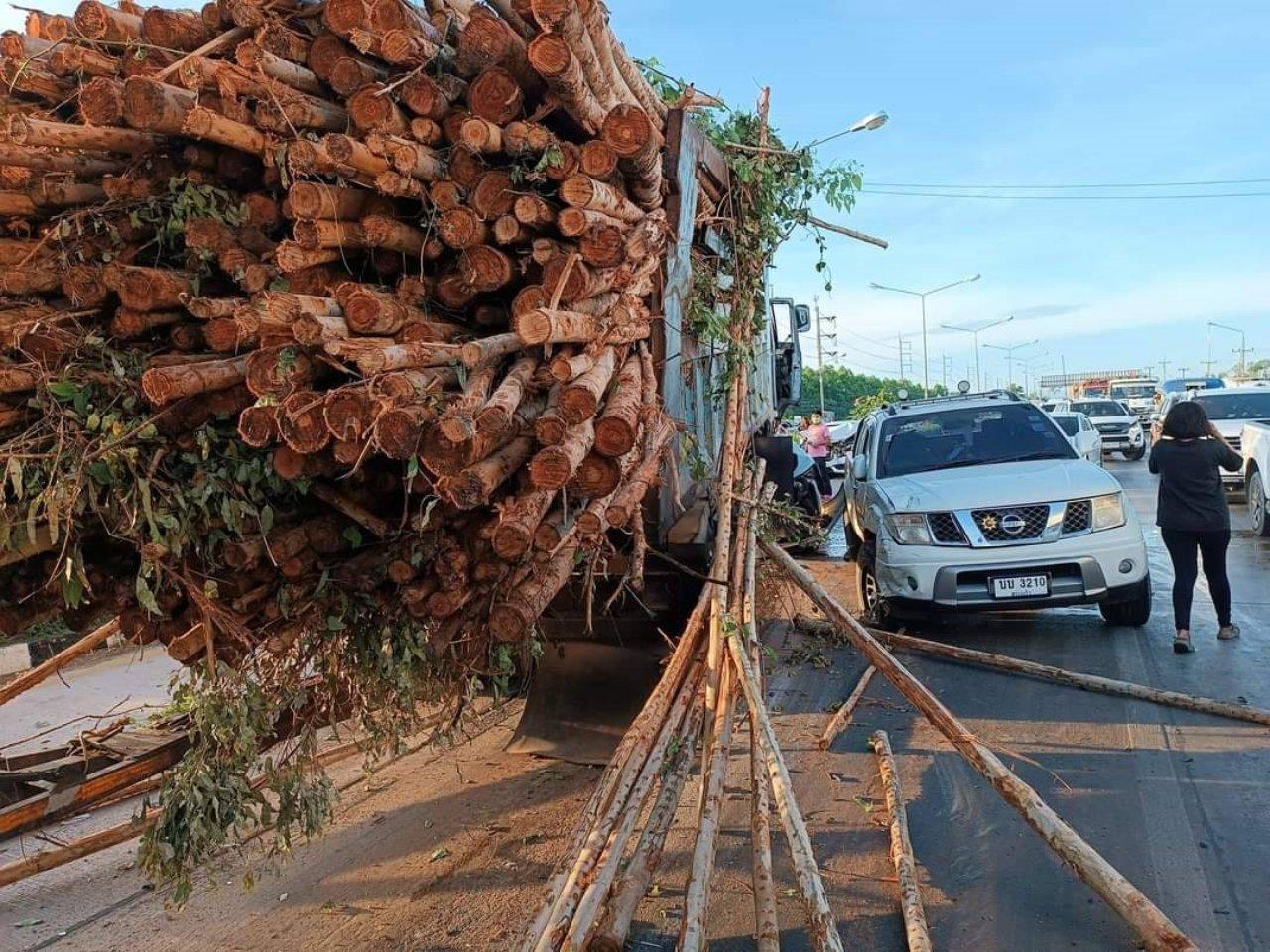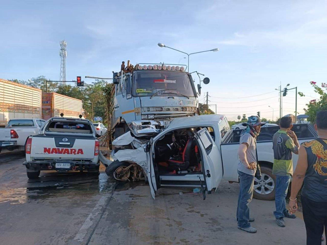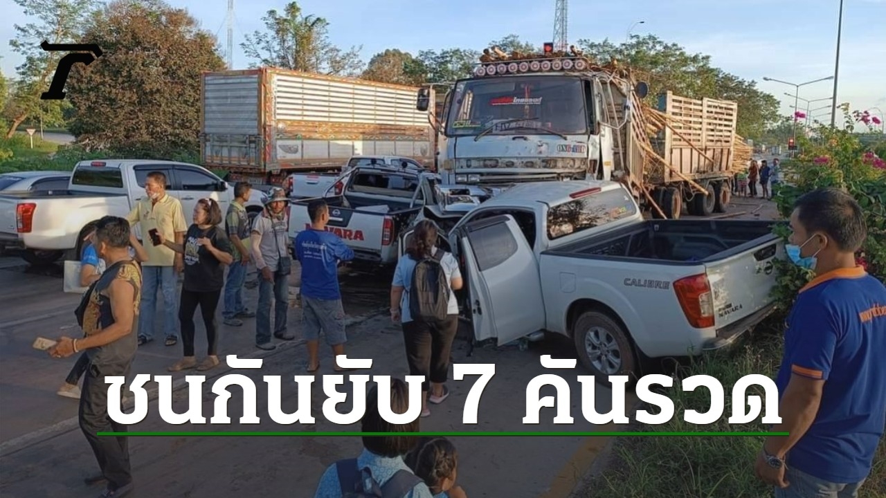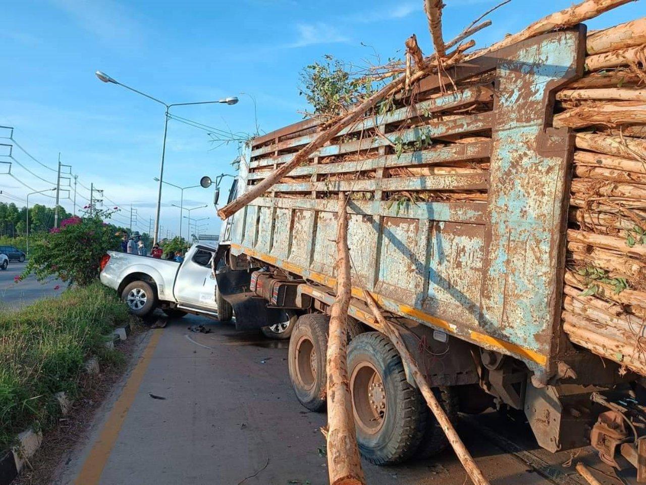 อุบัติเหตุกลางสี่แยกไฟแดงสระขวัญ ถนนสาย 317 ตัดกับถนนสาย 359 อ.เมือง สระแก้ว มีผู้บาดเจ็บ 4 ราย หลัง 18 ล้อบรรทุกไม้ยูคาข้ามเลน ชนสนั่น 7 คันรวด ลุงกับหลานที่นั่งในกระบะรอดปาฏิหาริย์