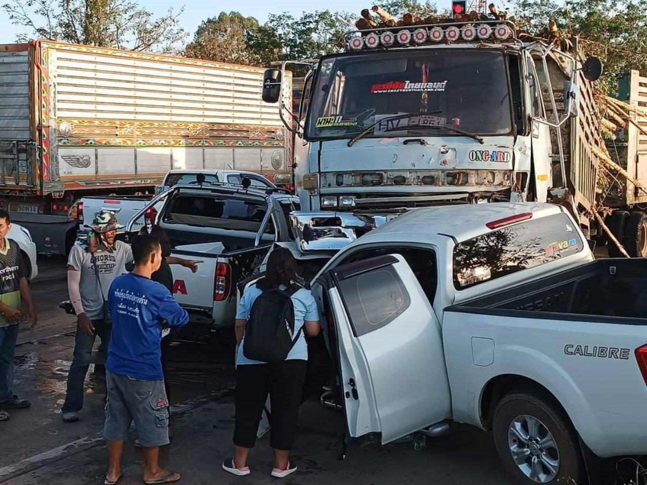 ที่เกิดเหตุพบรถบรรทุกพ่วง 18 ล้อ หมายเลขทะเบียนหัวลาก 81-5171 สก. ลูกพ่วง 82-1851สก. สภาพด้านหน้าพังยับเยิน ชนติดอยู่กับรถกระบะแค็บ หมายเลขทะเบียน บน-4608 สระแก้ว สภาพด้านหน้าพังยับเยินถึงห้องโดยสาร มีผู้โดยสารมาด้วยกันทั้งหมด 4 คน ได้รับบาดเจ็บเล็กน้อย และติดกันพบกระบะนิสสัน นาวาร่า ทะเบียน บบ-3210 สก ด้านข้างพังยับ ผู้โดยสาร 5 คนมีผู้รับบาดเจ็บ 1 รายหัวแตก ใกล้กันพบรถยนต์เก๋งยี่ห้อฮอนด้า ทะเบียน 7กม-2227 กรุงเทพฯ ไม่มีผู้รับบาดเจ็บ สภาพด้านหน้าพังเสียหาย รวมรถยนต์ที่ได้รับความเสียหายจำนวน 7 คันมีผู้ได้รับบาดเจ็บ 4 ราย นำส่งโรงพยาบาลสมเด็จพระยุพราชสระแก้ว