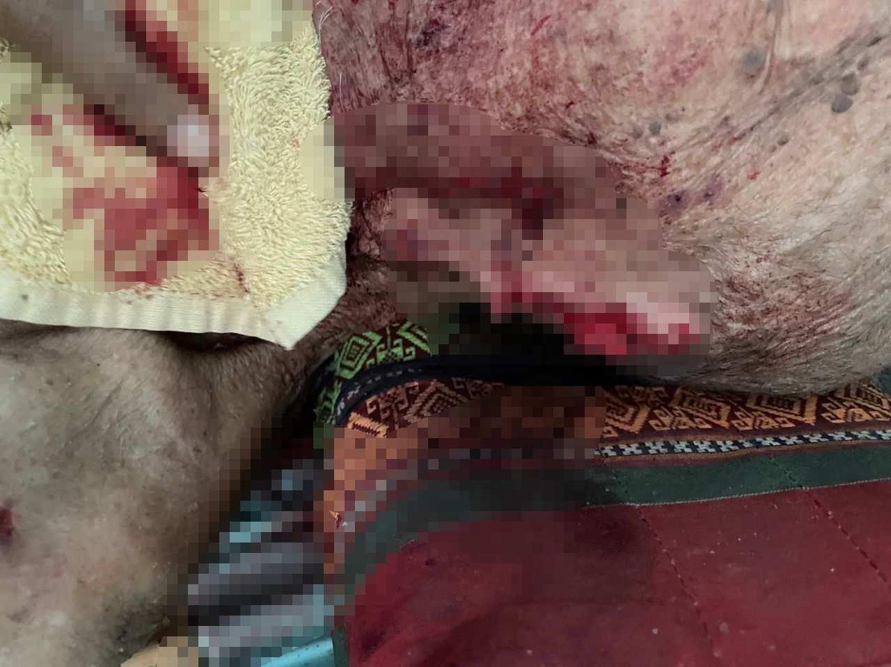 ที่เกิดเหตุพบผู้บาดเจ็บจำนวน 1 ราย เป็นผู้สูงอายุและเป็นผู้ป่วยติดเตียงทราบชื่อ คือ นายสมบูรณ์ หาญจริง อายุ 80 ปี พบแผลฉกรรจ์ที่บริเวณลำคอและใบหูที่ฉีกขาด และอีกหลายจุดตามร่างกาย ผู้บาดเจ็บนอนร้องด้วยความเจ็บปวด ด้วยความทุกข์ทรมาน อยู่บนที่นอน เนื่องจากไม่สามารถช่วยเหลือตัวเองได้