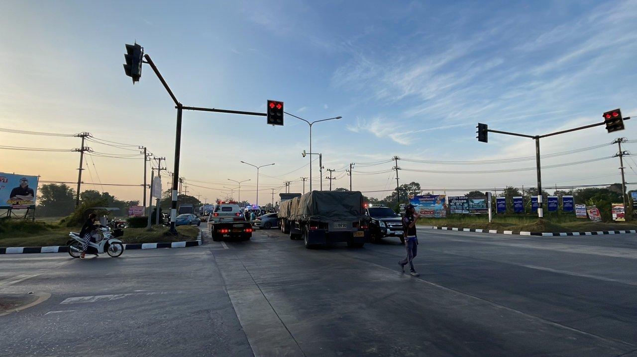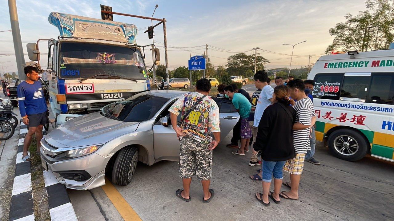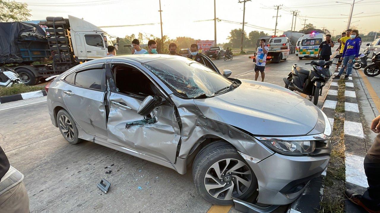 รถบรรทุก 18 ล้อพุ่งชนเก๋งเลขานายก อบต.เขาพระ ตัวติดคาอยู่ในรถ ตรงแยกไฟแดงศรีนาวา เขต อ.เมือง จ.นครนายก ตร.สอบสวนคนขับรถบรรทุกอ้างเจอสัญญาณไฟเหลืองแดง บีบแตรและส่งสัญญาณไฟแล้วว่าเบรกไม่อยู่