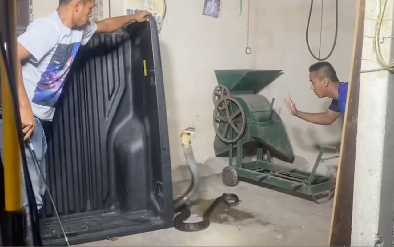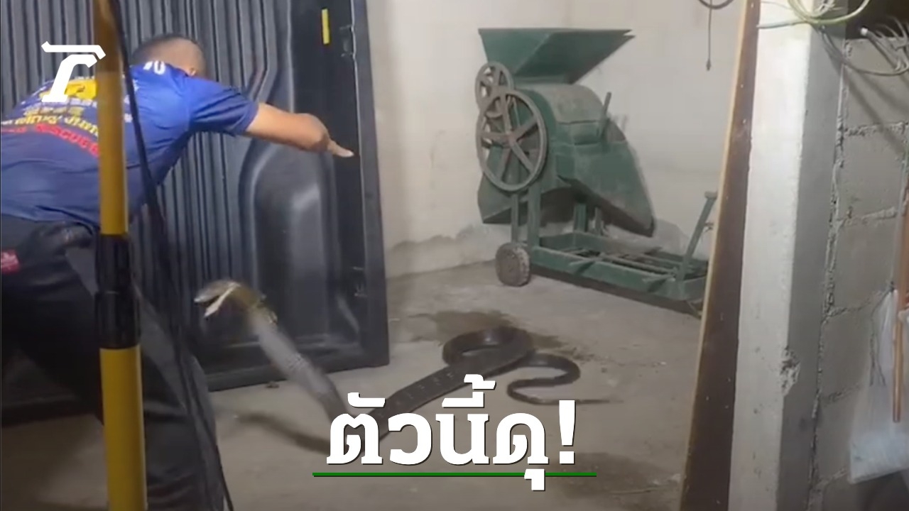 งูจงอางขนาดใหญ่เลื้อยเข้าบ้านผู้ใหญ่บ้านที่จันทบุรี แจ้งทีมงาน “อาสาพิทักษ์งูเมืองจันท์” ไปจับ กลับสู้พุ่งเข้าฉก แต่ถูกทีมหมองูใช้ความชำนาญลากออกมาในที่โล่ง จับด้วยมือเปล่า วัดความยาวได้ 4 เมตร น้ำหนัก 6 กก.