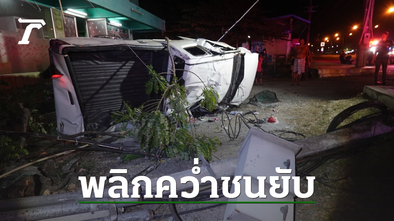สาว 27 ขับกระบะมาด้วยความเร็ว เสียหลักหมุนปีนฟุตปาท-พลิกคว่ำชนตู้ชุมสายอินเทอร์เน็ต-ฟาดเสาไฟฟ้า รถพังยับ บาดเจ็บติดภายในรถ