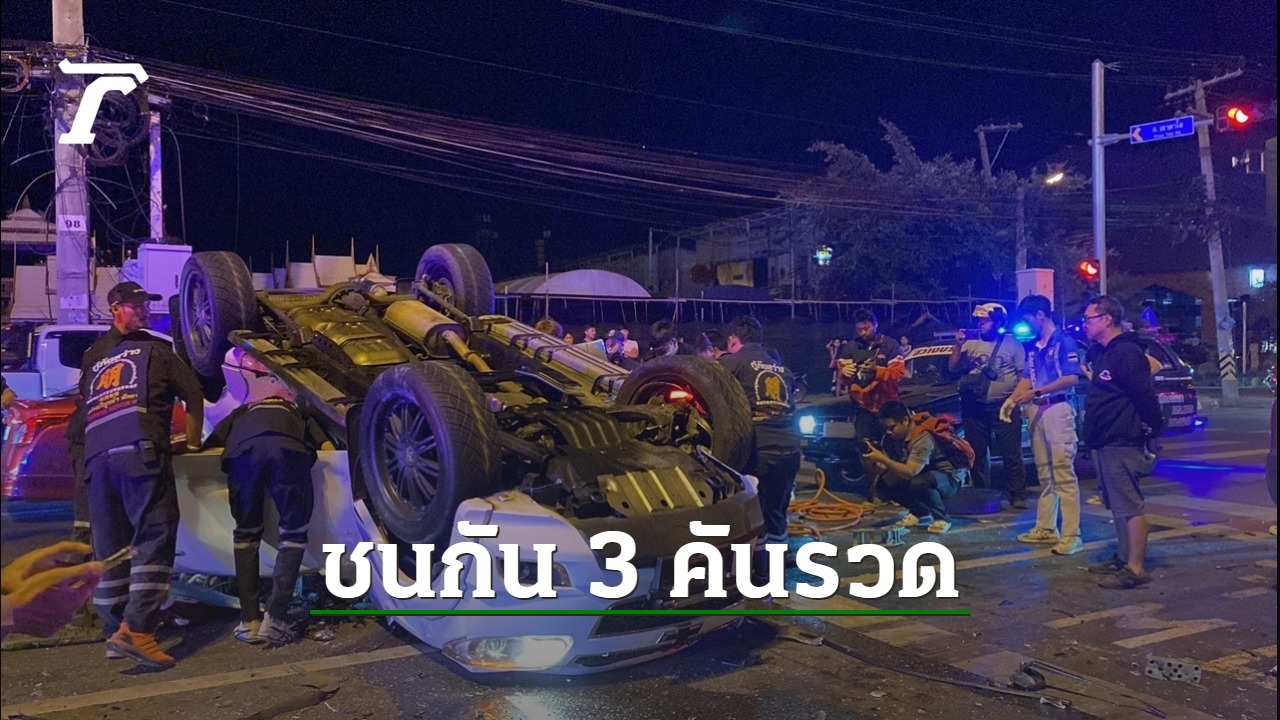 รถชนสนั่น 3 คันรวดกลางไฟแดงพัทยา พลิกคว่ำล้อชี้ฟ้า กู้ภัยต้องใช้เครื่องตัดถ่างนำคนขับออกจากรถอย่างทุลักทุเล ทำเอารถติดยาวเป็นกิโล