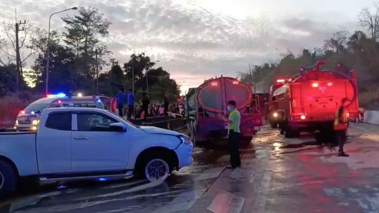 หลังรับแจ้ง จึงได้ประสานรถดับเพลิงจาก อบต.บุพราหมณ์ และ อบต.ใกล้เคียง พร้อมหน่วยกู้ภัยสัจจะพุทธธรรมกบินทร์บุรี ได้เดินทางไปยังที่เกิดเหตุเป็นการด่วน พบว่าที่บริเวณข้างขึ้นเขาโทนมีรถติดเป็นระยะทางยาวหลายกิโลเมตร ทางเจ้าหน้าที่จึงต้องขับย้อนศรขึ้นเขาโทนเป็นการด่วน เมื่อเจ้าหน้าที่เดินทางไปถึง พบรถบรรทุกพ่วงบรรทุกน้ำตาลชนกับรถบรรทุกพ่วง บรรทุกน้ำเกลือ และรถกระบะอีซูซุ 4 ประตู สีขาว ทะเบียน 2ฒฮ 7704 กรุงเทพฯ และรถเทรลเลอร์ 1 คัน รวม 4 คัน มีไฟลุกท่วมที่หัวเก๋งรถบรรทุก