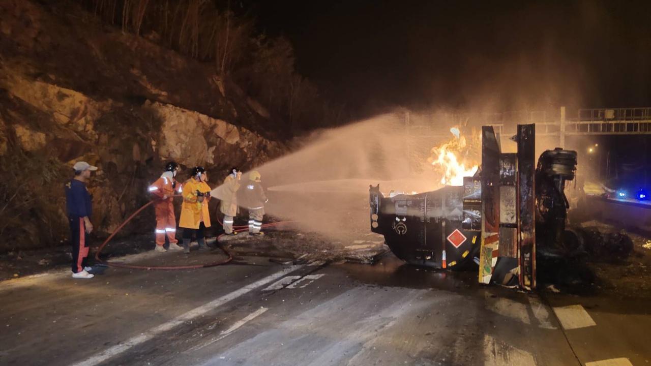 รถพ่วงบรรทุกน้ำมันเอทานอลกว่า 3 หมื่นลิตร แหกโค้งพลิกคว่ำ บนถนน 304 ช่วงทางลงเขา หน้าศาลปู่โทน ไฟลุกพึ่บเผาวอดทั้งคัน-คนขับเจ็บ 1 มีเสียงระเบิดดังเป็นระยะๆ เจ้าหน้าที่ต้องปิดเส้นทางจราจร 2 ฝั่ง ทั้งขาขึ้นขาลง เพื่อป้องกันความปลอดภัย