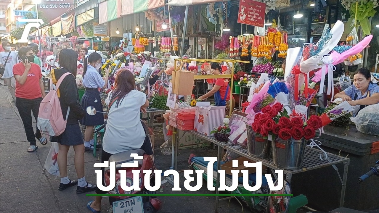 แผงขายดอกไม้ตลาดเทศบาลเมืองศรีราชา คนออกมาซื้อดอกไม้กันบางตา โดยส่วนใหญ่เป็นวัยทำงานออกมาซื้อดอกกุหลาบ เพื่อนำไปมอบให้กับคนรัก เพื่อนสนิท แม่ค้าบ่นปีนี้ไม่คึกคัก เพราะผู้ซื้อส่วนใหญ่จะหันไปสั่งทางออนไลน์