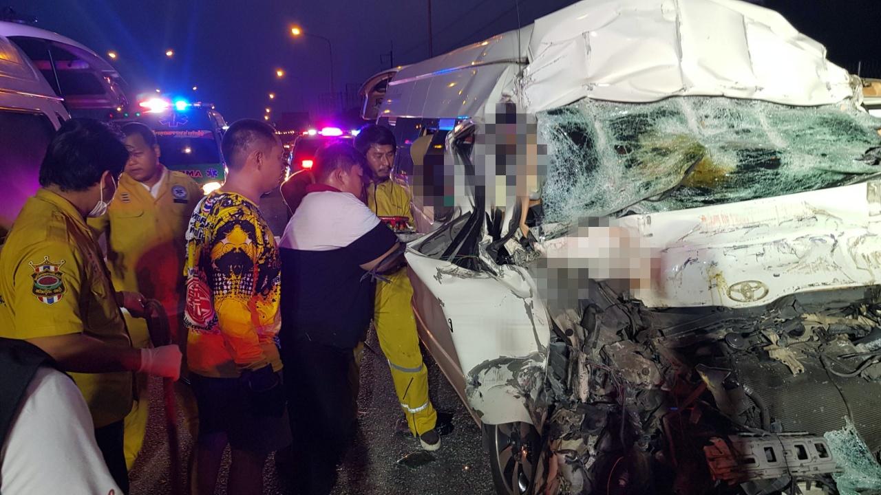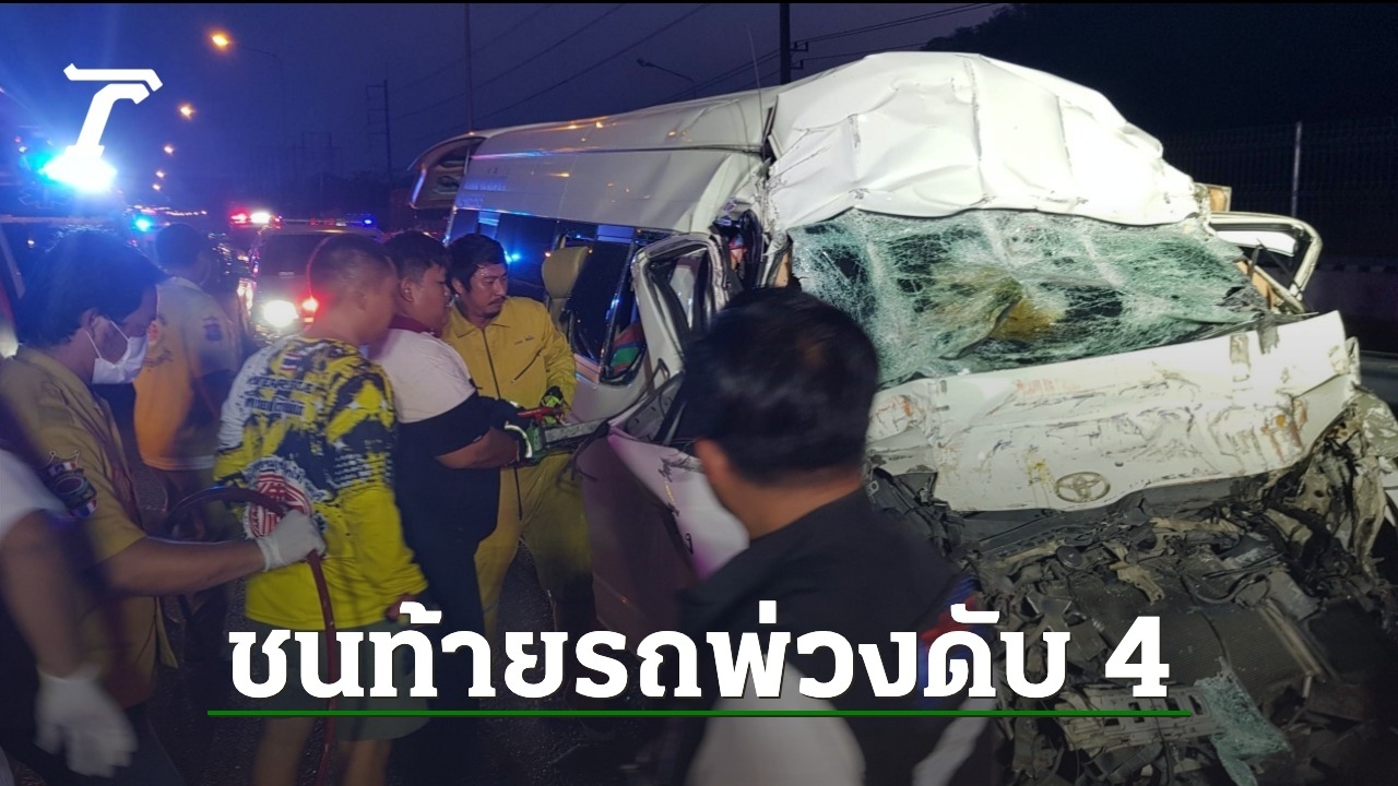 รถตู้รับแรงงานเมียนมา กัมพูชา จากกรุงเทพฯ จะไปส่งที่จันทบุรี เพื่อต่ออายุบัตรต่างด้าว พุ่งชนท้ายรถพ่วงบนมอเตอร์เวย์ ช่วงอ.เมืองชลบุรี มีผู้เสียชีวิต 4 ราย บาดเจ็บ 9 คนขับรถตู้ตายด้วย คาดว่าน่าจะหลับใน