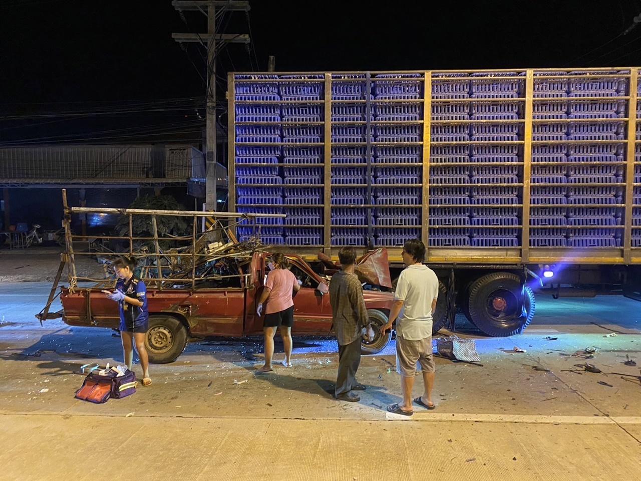 เกิดอุบัติเหตุรถกระบะพุ่งชนท้ายรถบรรทุกเป็ดอย่างจัง ใน จ.ฉะเชิงเทรา ทำให้รถกระบะเสียหายอย่างหนัก แต่ตัวคนขับเคราะห์ดีรอดตาย และบาดเจ็บเพียงเล็กน้อย