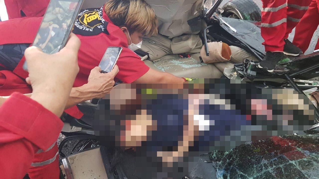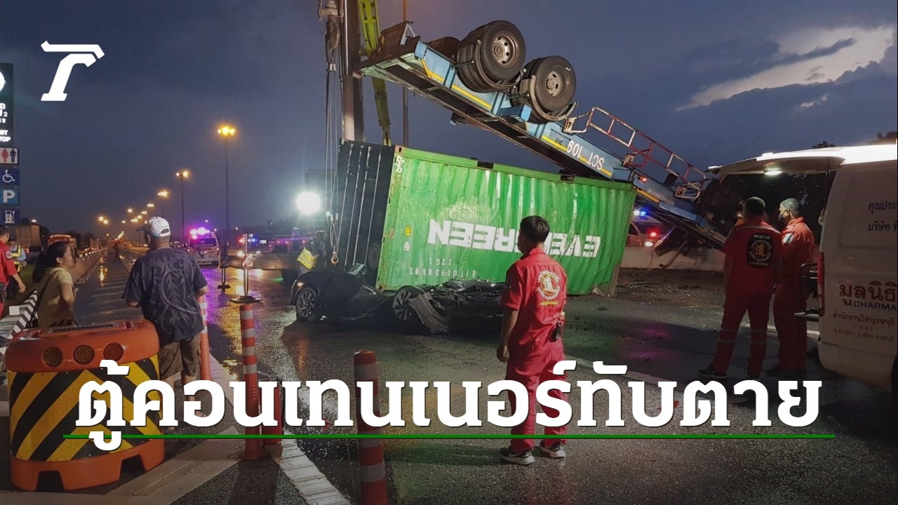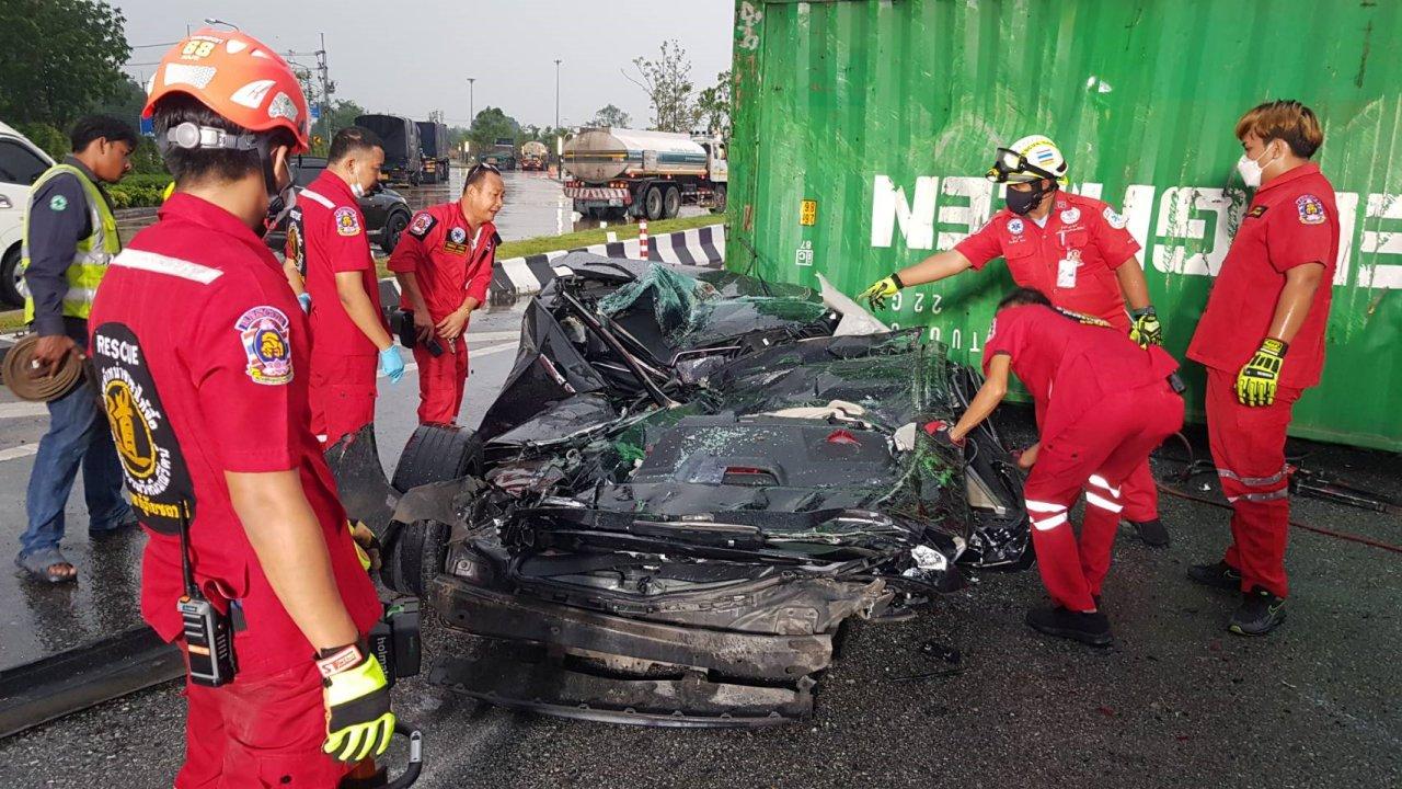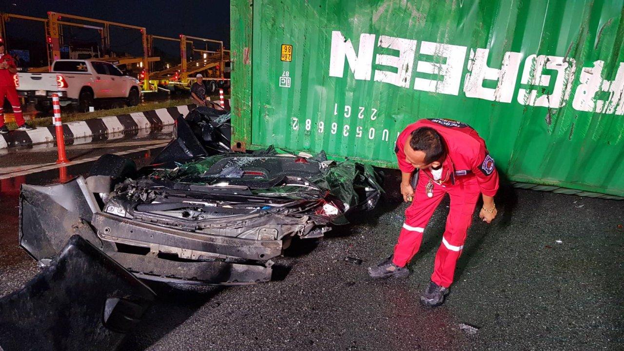 ขณะที่ ส่วนหางขวางกลางถนนส่วนตู้คอนเทนเนอร์ทับรถเก๋งยี่ห้อฮอนด้า ซีวิค สีดำ ทะเบียน 5 กอ 2419 กรุงเทพฯ สภาพแบนเป็นเศษเหล็กที่นั่งคนขับพบศพ น.ส.สันธิยา บัวงาม อายุ 34 ปี อยู่บ้านเลขที่ 33 หมู่ 8 ต.ดองกำเม็ด อ.ขุขันธ์ จ.ศรีสะเกษ สภาพศีรษะแตกแขนขาหัก ดับคาซากรถเก๋ง นอกจากนี้ยังมีรถเก๋งยี่ห้อโตโยต้า วีออส สีบรอนซ์เทา ทะเบียน กท 1372 สมุทรปราการ สภาพด้านข้างซ้ายพังยับเยิน สอบถาม น.ส.ฐิติมา โลกนิมิตร อายุ 29 ปี คนขับเผยว่า ไม่รู้ว่ารถที่พลิกคว่ำมากันอย่างไร หรือชนกันอย่างไร แต่รถมากระแทกรถตนพังเสียหาย