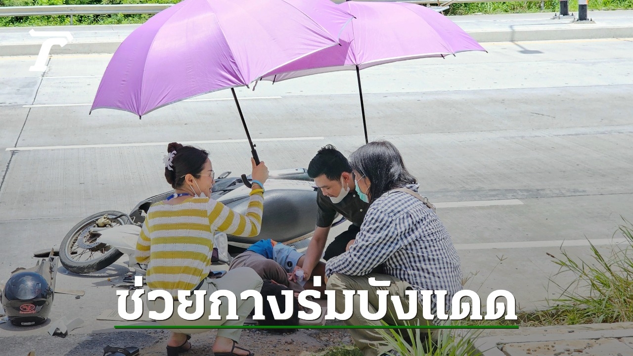 ผู้ผ่านไปมาบนถนนสุขุมวิท ที่สัตหีบ ชลบุรี พบเห็นภาพประทับใจ พนักงานห้างฯ 3 คน รุมกางร่มกันแดดให้ผู้บาดเจ็บจากอุบัติเหตุ จยย.ชนท้ายรถกระบะ ยืนตากแดดร้อนเปรี้ยงอยู่ร่วมครึ่งชั่วโมง