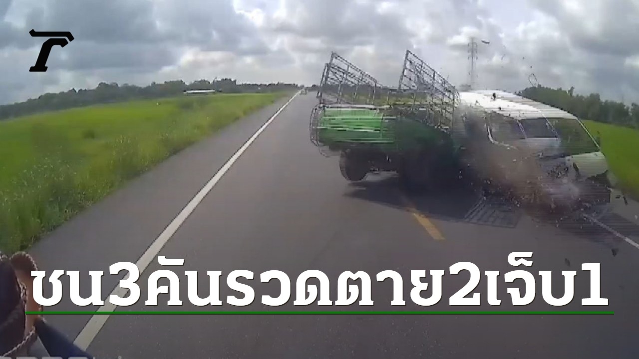 กระบะแซงซ้ายรถบรรทุกมะม่วงไม่พ้น เสียหลักข้ามเลนชนรถตู้ส่งสินค้าดอกบัวคู่ที่สวนมา บนถนนสาย 33 ตัดใหม่ จนตกถนน ก่อนถูกรถบรรทุกเบรกไม่อยู่ชนซ้ำแหลกยับ คนบนรถตู้ตาย 2 สาหัส 1 กล้องหน้ารถจับภาพตอนชนได้