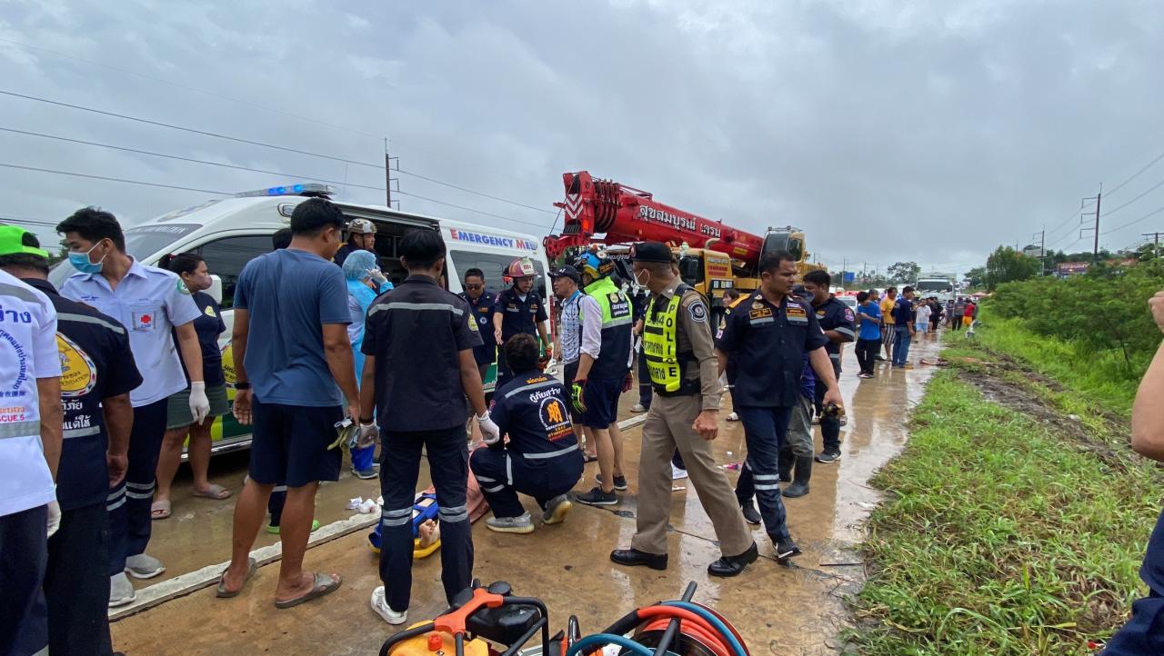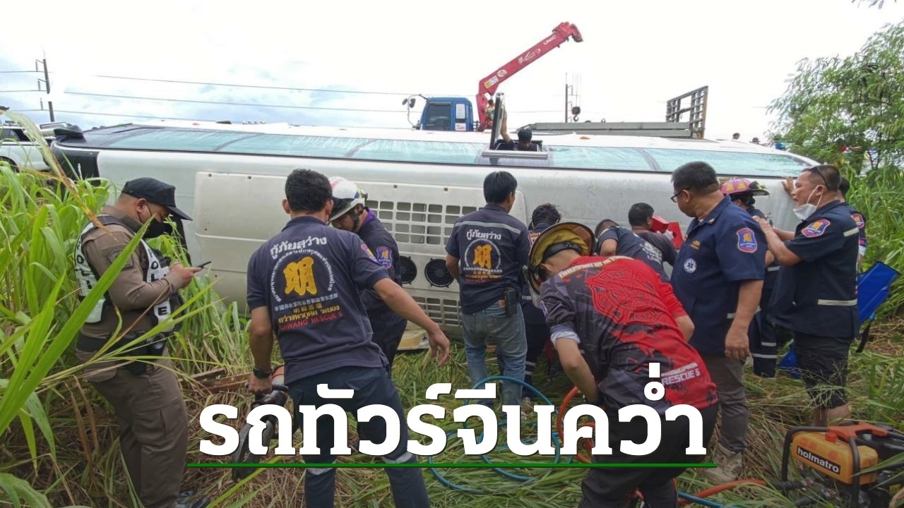 รถทัวร์จีนฝ่าสายฝนพลิกคว่ำ ขณะพานักท่องเที่ยวชาวจีน รวมคนขับ 27 ชีวิต กลับจากเกาะเสม็ดไปพัทยา ถูกรถทับร่าง 4 ราย ต้องใช้รถเครนยกรถ พร้อมกู้ภัยช่วยตัดถ่างออกมาได้ ส่วนที่เหลือปลอดภัย คนขับเผยถนนลื่นจนเสียหลัก บังคับรถไม่อยู่