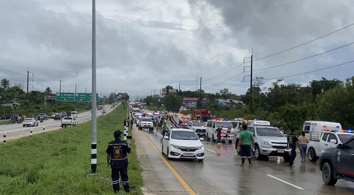 เมื่อไปถึงที่เกิดเหตุ ซึ่งฝนกำลังตกลงมาอย่างไม่ขาดสาย ถนนเจิ่งนองไปด้วยน้ำ โดยรถติดยาวกว่า 2 กิโลเมตร ที่เกิดเหตุพบรถทัวร์สีขาว ยี่ห้อ ZUNLONG เลขทะเบียน 30-2297 ปทุมธานี พลิกคว่ำอยู่ตรงร่องเกาะกลางถนน โดยมีคนติดอยู่ในรถ ซึ่งเป็นนักท่องเที่ยวสัญชาติจีนและคนขับ รวม 27 คน ที่ได้รับบาดเจ็บ โดยถูกรถทับร่างติดคาไว้จำนวน 4 ราย เจ้าหน้าที่จึงรีบช่วยกันนำตัวออกมาปฐมพยาบาล โดยนำผู้ที่ได้รับบาดเจ็บรุนแรงส่งโรงพยาบาล พร้อมทั้งประสานรถเครนมายกรถทัวร์ขึ้น เพื่อนำร่างของผู้ที่ถูกรถทับออกมา
