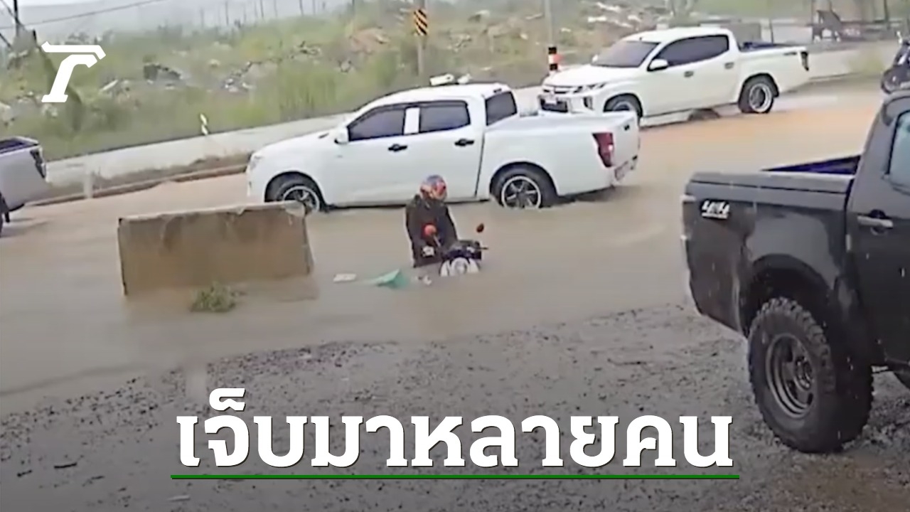 หนุ่มขี่รถจักรยานยนต์ตกลงไปในท่อระบายน้ำริมถนน หลังฝนตกหนักน้ำท่วมขัง ท่อระบายน้ำไม่มีฝาปิด โชคดีมีคนเห็น รีบวิ่งมาช่วย