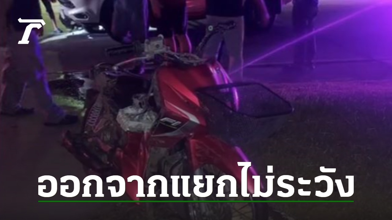หนุ่มสุรินทร์วัย 28 ปี ขับ จยย.พุ่งออกจากแยกกระทันหัน-ไม่ระวังรถทางตรง ถูกรถยนต์เอสยูวีป้ายแดงพุ่งชน กระเด็นโดนเก๋งนอนแน่นิ่งคาถนน จนท.สุดยื้อเสียชีวิตคาที่