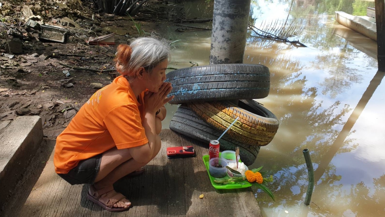 เมื่อเดินทางไปถึงพบกับ น.ส.เพ็ญนภา อายุ 43 ปี ภรรยาของ นายศราวุธ ผู้สูญหาย กำลังนำเครื่องเซ่น แกงหอยขม ปลาเค็ม และขนม ดอกไม้ พร้อมจุดธูปที่ริมแม่น้ำ ตรงจุดที่สามีหายไป เพื่อบนบานให้พบตัวโดยเร็ว