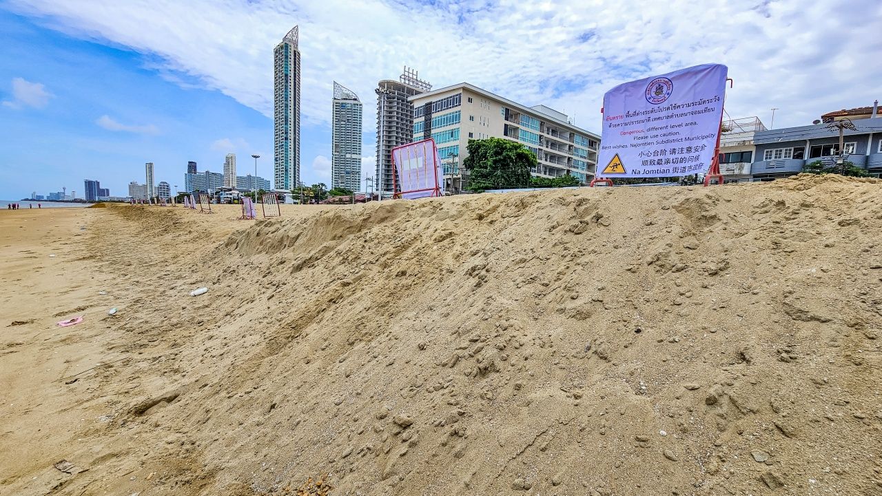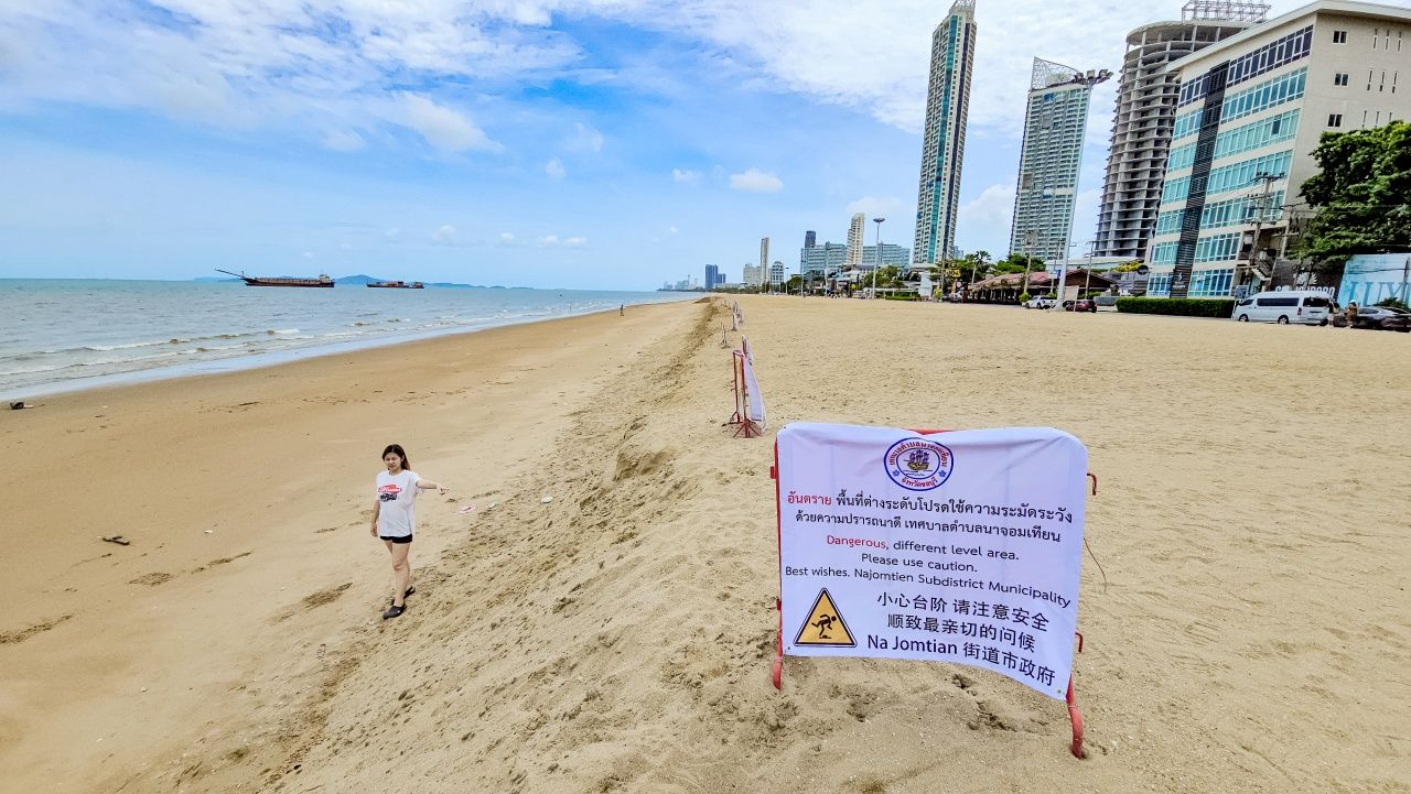 เขตอันตราย ทะเลกลืนกินหาดทรายนาจอมเทียน ยุบหายไป 400 เมตร ทำให้พื้นทรายมีลักษณะสูงชัน บางจุดความสูงเกือบ 2 เมตร ไล่ระดับลงไปไม่เท่ากัน เสี่ยงต่อการตกลงไป โดยเฉพาะเวลากลางคืน