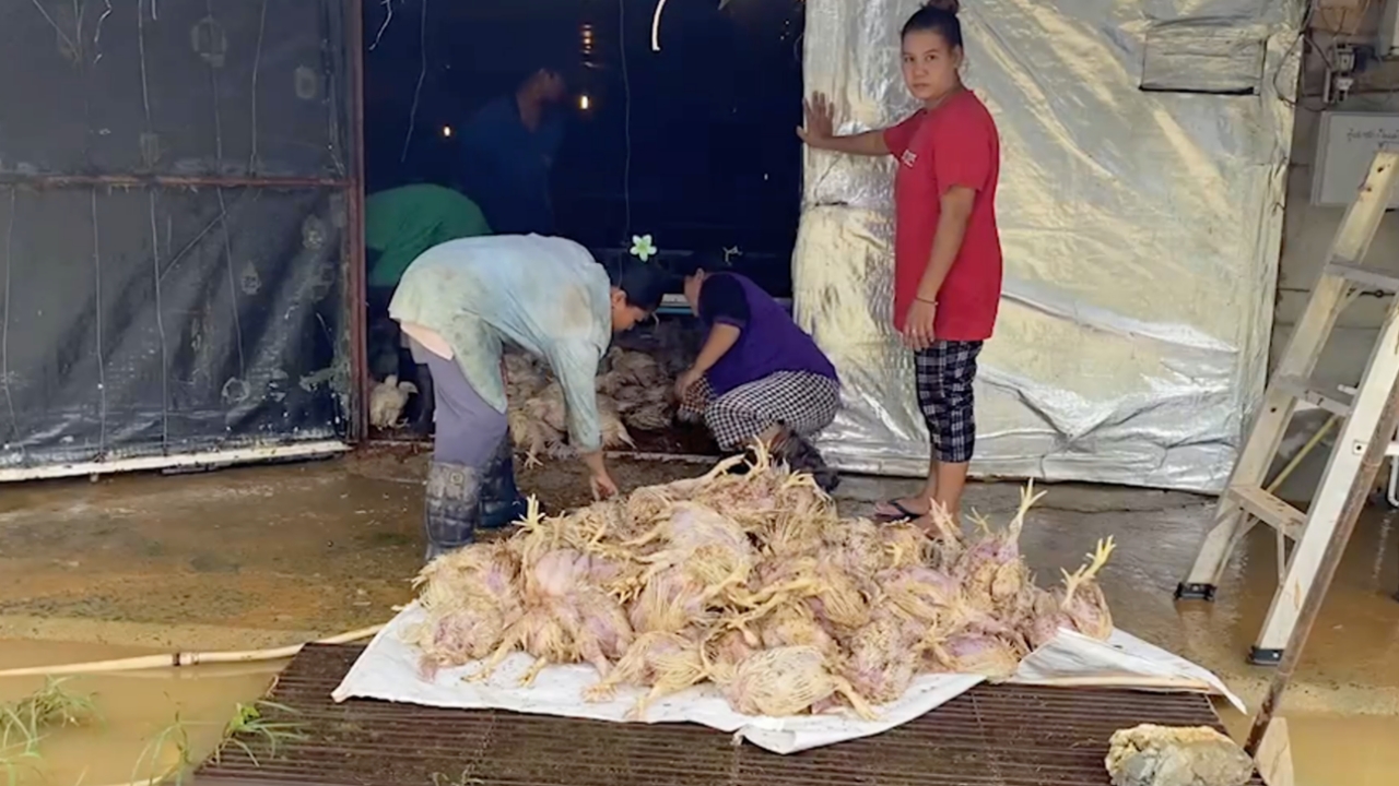ล่าสุด กำลังจะจับไก่ขายได้แล้ว ถูกน้ำป่าไหลเข้าท่วมอย่างรวดเร็ว ระดับน้ำสูงประมาณ 70 ซม. จึงทำให้ไก่จำนวน 40,000 ตัว ถูกน้ำท่วมตายกว่า 30,000 ตัว ที่เหลือรอดประมาณ 10,000 ตัว