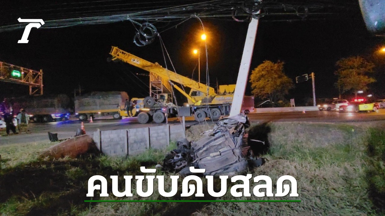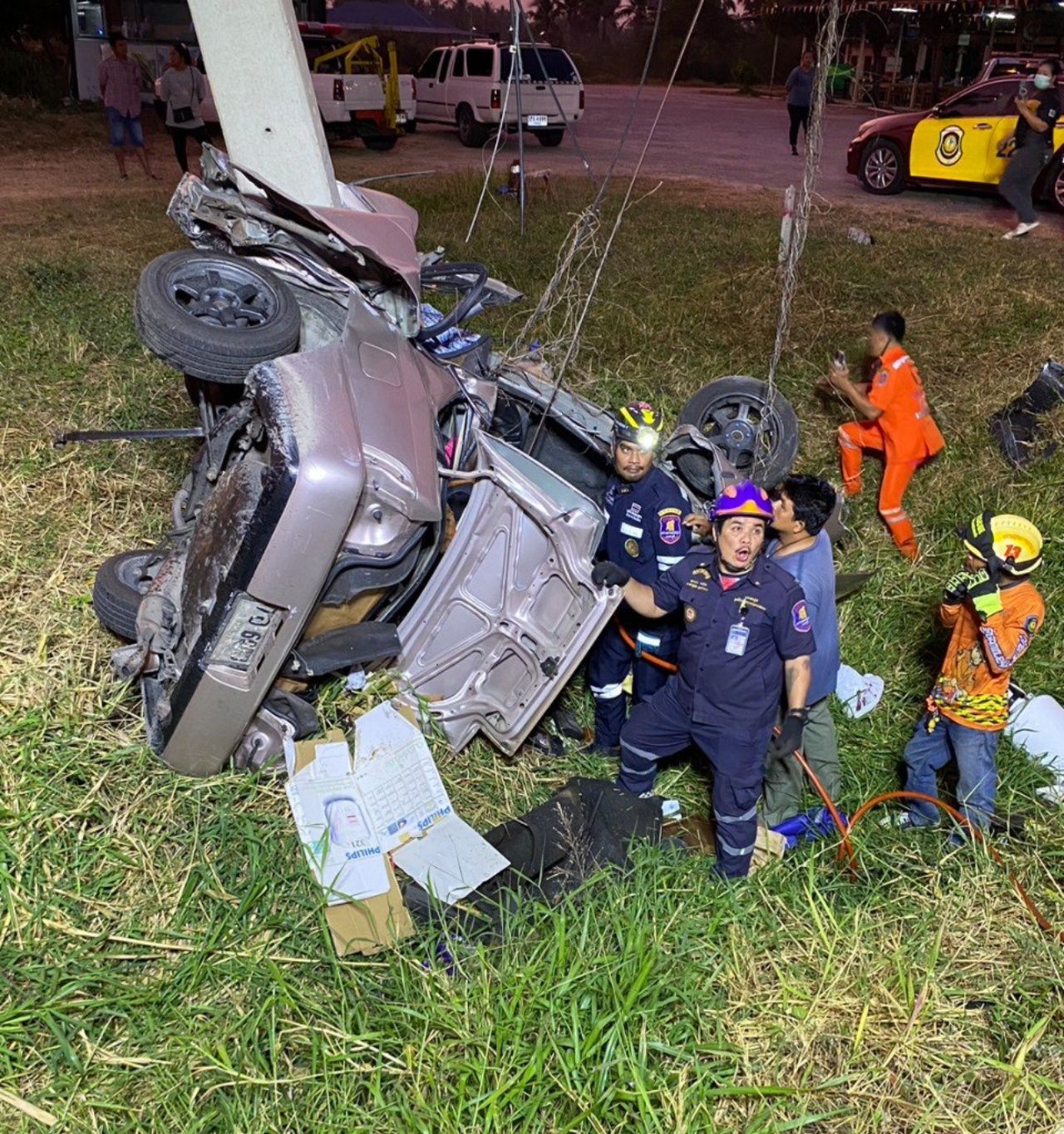 ที่เกิดเหตุพบรถยนต์เก๋ง ยี่ห้อ Toyota สีบรอนซ์เงิน หมายเลขทะเบียน 7อ-6073 กทม. ชนติดอยู่กับเสาไฟฟ้าแรงสูง สภาพตัวรถหัก 2 ท่อน พังยับเยินไปทั้งคัน ทรัพย์สินและเอกสารต่างๆ ตกกระจัดกระจายไปทั่วบริเวณ ภายในรถพบผู้เสียชีวิตอัดก๊อปปี้ติดอยู่กับพวงมาลัยเบาะคนขับ เจ้าหน้าที่กู้ภัยฯ ต้องใช้อุปกรณ์เครื่องตัดถ่างเข้าดำเนินการงัดซากรถ เพื่อเคลื่อนย้ายร่างผู้เสียชีวิตออกมาด้านนอก ซึ่งต้องใช้รถเครนขนาดใหญ่ จำนวน 2 คัน มาพยุงเสาไฟฟ้าแรงสูงต้นดังกล่าวเอาไว้ไม่ให้ล้ม
